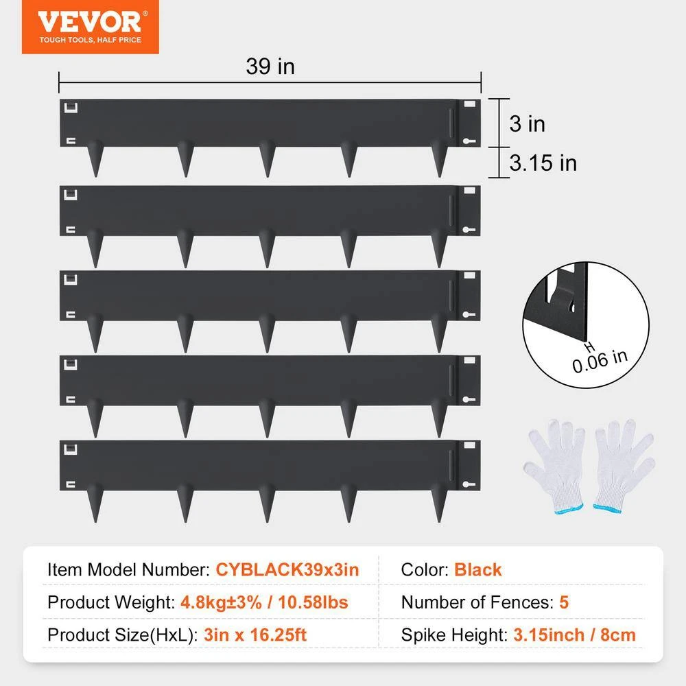 - Specifications: 39 in. x 3 in. color: black, number of fences: 5, spike height: 3.15 in./8 cm, product weight: 4.8 kg plus 3%/10.58 lbs., product size: 3 in. H x 16.25 ft. L