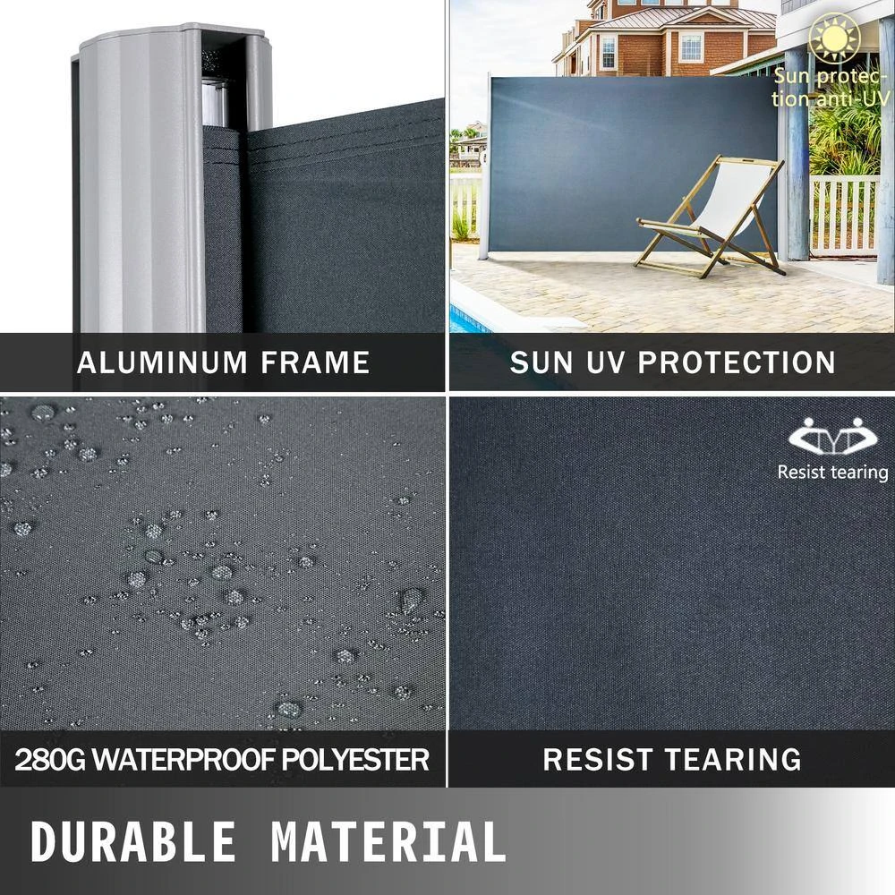 - HIGH-QUALITY SCREEN MATERIALS: This side awning is composed of aluminum alloy frame that is sleek and resistant to rust; 280g/sq.m polyester fabric coated with PU layer is breathable, waterproof, UV resistant, and flame retardant
