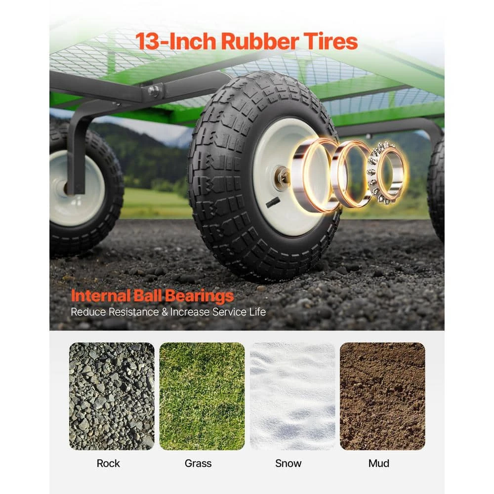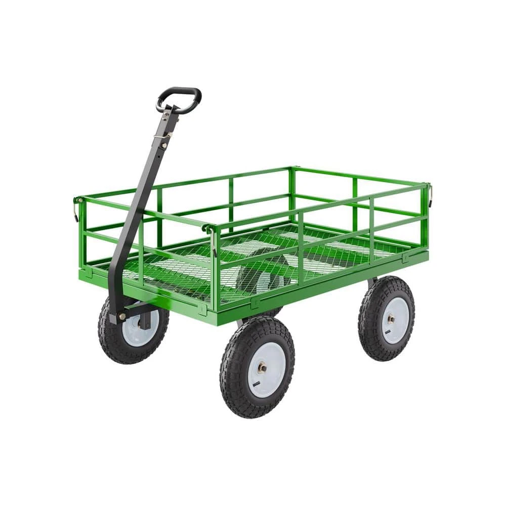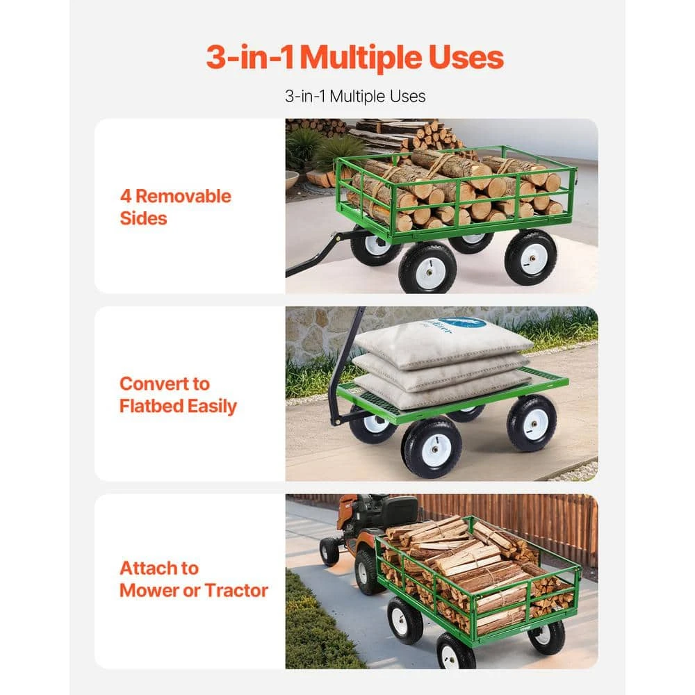 1200-lbs. Capacity Heavy-Duty Garden Cart. Built with Q235 steel, this garden cart offers a 2-in-1 design, easily switching between a fenced cart and a flatbed cart. Equipped with 13 in. rubber tires, it glides smoothly across various terrains. The versatile 2-in-1 handle allows pushing and trailer towing for gardens, farms, warehouses.