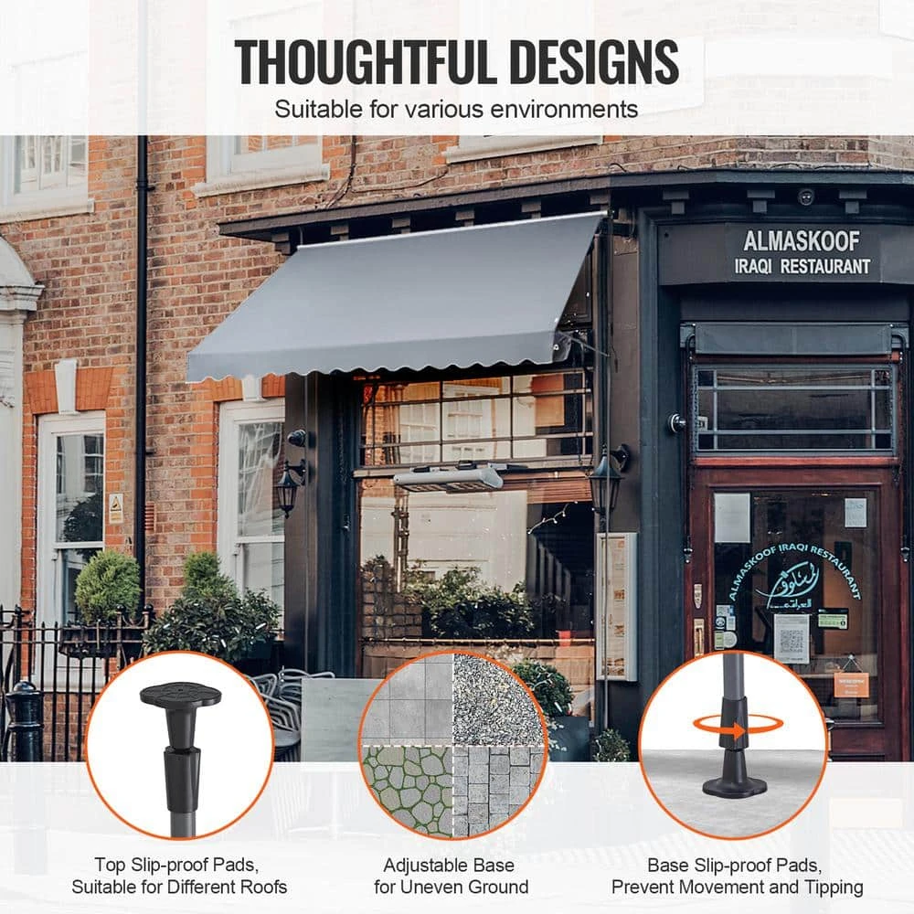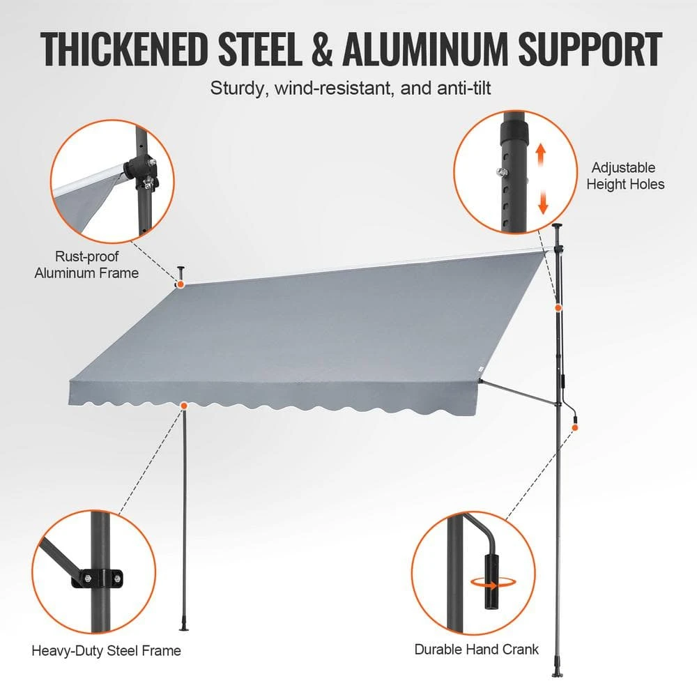 VEVOR Patio Awning Retractable-Transform Your Outdoor Space with Our Easy-to-Install Retractable Patio Awning. The large 138 x 47 in. retractable patio awning is primarily made from steel and features a 180 G double-sided PU coating, providing UV protection with a rating of UV 80-plus. It offers sunshade and waterproof capabilities, with an adjustable support pole height from 86 to 122 in., making it suitable for various door and window heights. The fabric can be easily extended and retracted for storage, ensuring user-friendly operation without the need for drilling, and can be installed by 1-person.