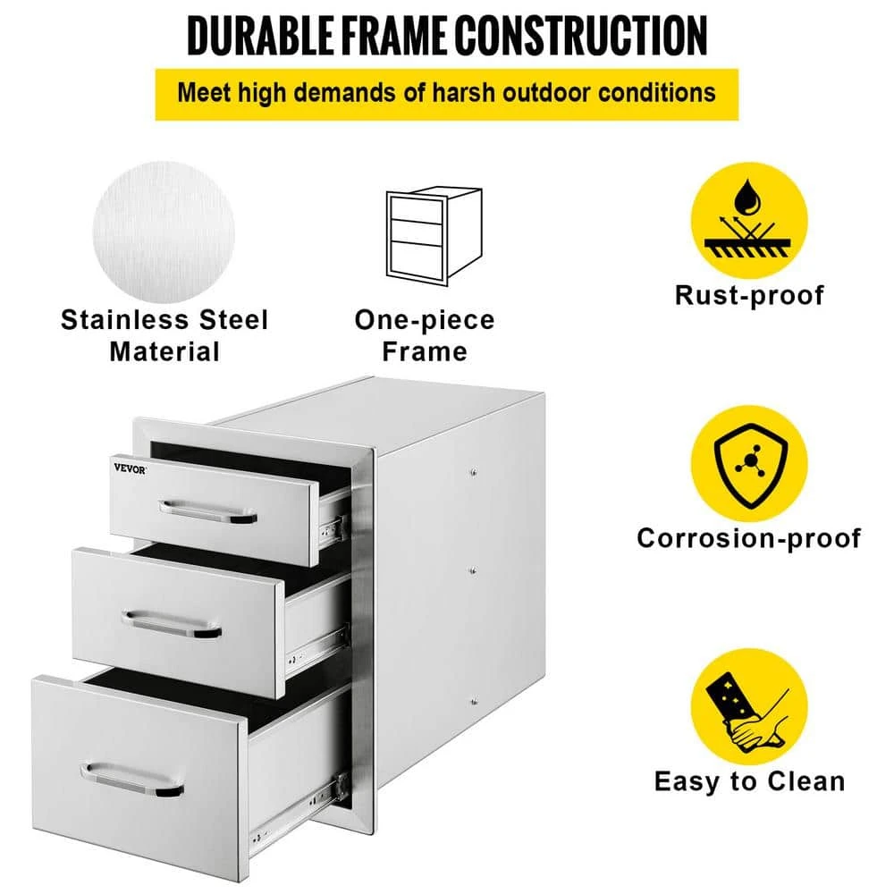 VEVOR Premium outdoor kitchen drawers with double storage space, ensuring a large storage space to put kitchen things. Made of stainless steel, it is durable and sturdy for long-time use. Also anti-corrosion and easy to clean. With the fully enclosed box, it can effectively prevent the insides from rain, wind, dust and insect. Perfect for the outdoor kitchen and BBQ island to use.