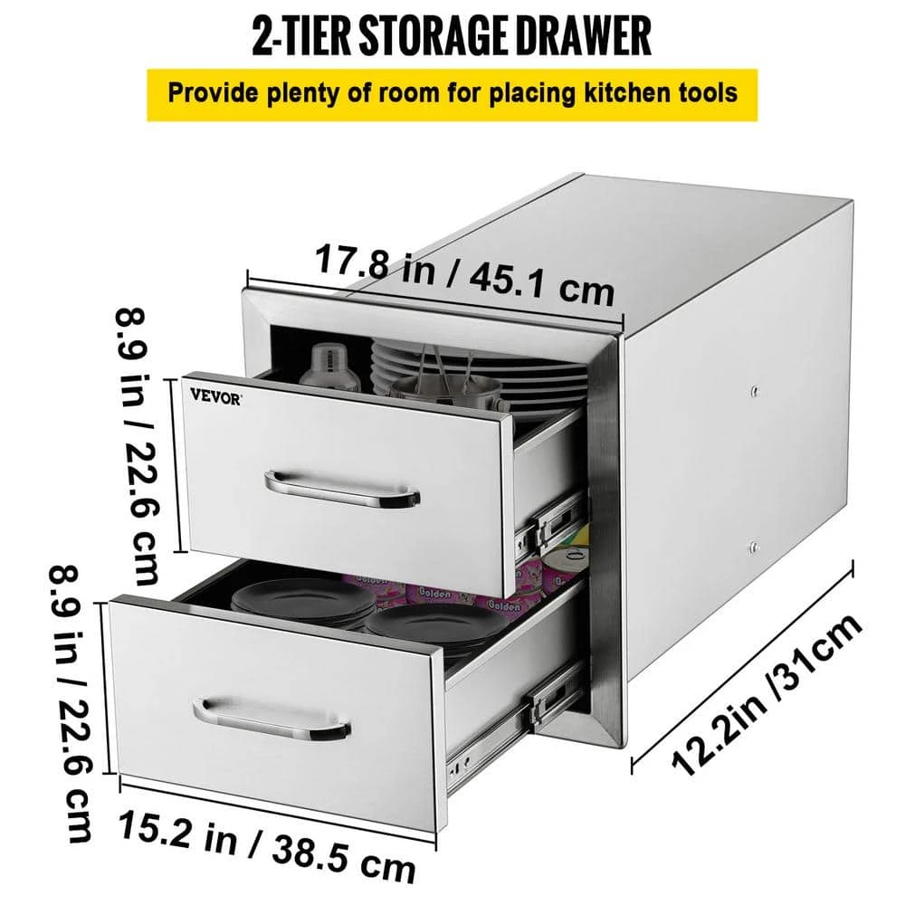 VEVOR Premium outdoor kitchen drawers with double drawers and a paper towel holder, ensuring a large storage space to put outdoor kitchen accessories. Made of stainless steel ensure durable and sturdy for long-time use. With the fully enclosed box, it can effectively avoid the entry of many kinds of foreign objects. Perfect for the outdoor kitchen and BBQ island to use.