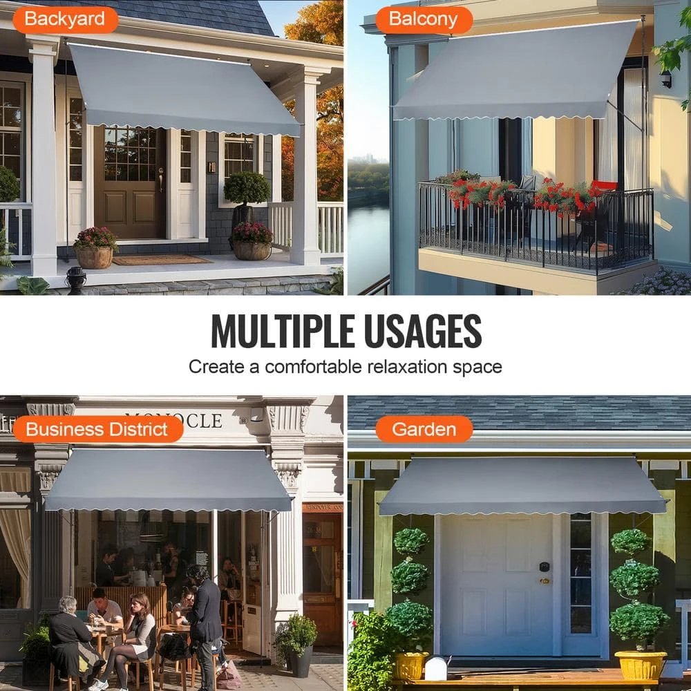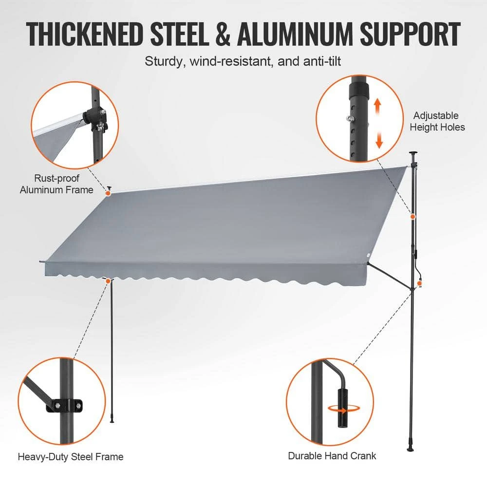 VEVOR Patio Awning Retractable-Transform Your Outdoor Space with Our Easy-to-Install Retractable Patio Awning. The large 178 x 47 in. retractable patio awning is primarily made from steel and features a 180 G double-sided PU coating, providing UV protection with a rating of UV 80-plus. It offers sunshade and waterproof capabilities, with an adjustable support pole height from 86 to 122 in., making it suitable for various door and window heights. The fabric can be easily extended and retracted for storage, ensuring user-friendly operation without the need for drilling, and can be installed by 1-person.