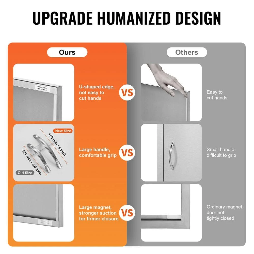 - Humanized design: delicate zinc alloy handles conforming to ergonomics, enlarged size for easy opening, the door frame edges are bent and thickened for safer use, providing a more user-friendly experience, allowing you to enjoy cooking in your outdoor kitchen without worries