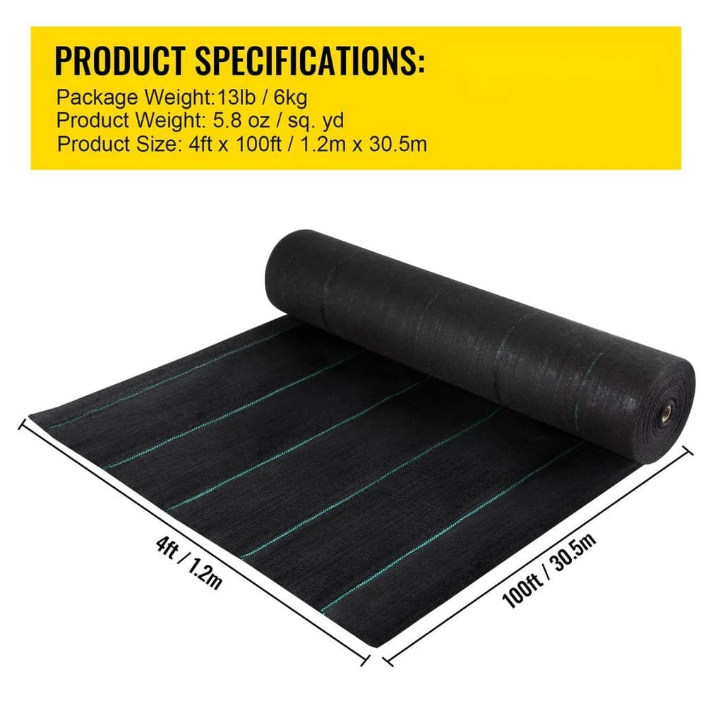 The VEVOR 4 ft. x 100 ft. Weed Barrier. Our weed barrier fabric, also a geotextile fabric, features premium material and a solid structure to withstand various weather conditions for long-lasting use, effectively inhibit weed or grass growth, and avoid direct sunlight. It is a great helper to thrive your plants and reduce soil erosion.This landscape weed barrier fabric is made of woven fabric(woven) and needle punched(non-woven), high density in 5.8oz, weather-proof and tear-proof. In addition, the durable polypropylene fabric will highly increase your efficiency.