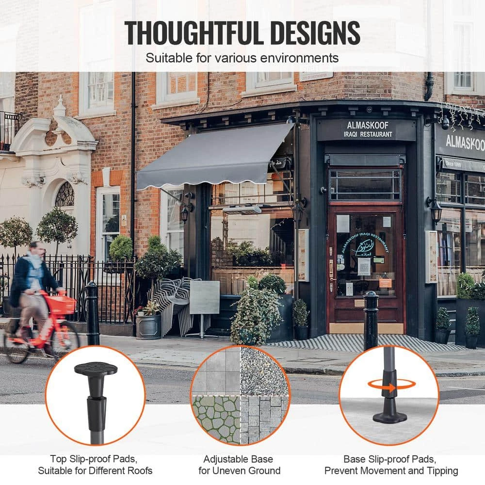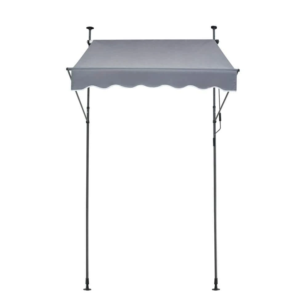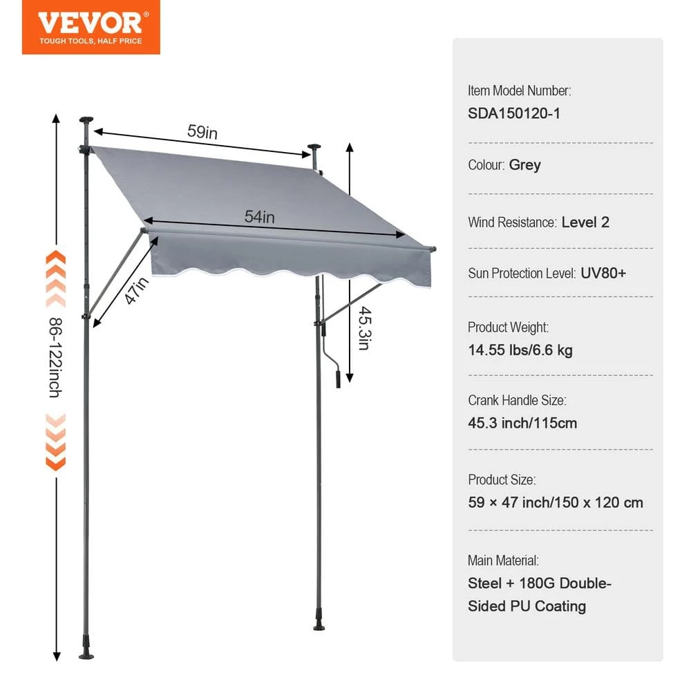 VEVOR Patio Awning Retractable-Transform Your Outdoor Space with Our Easy-to-Install Retractable Patio Awning. The large 59 x 47 in. retractable patio awning is primarily made from steel and features a 180 G double-sided PU coating, providing UV protection with a rating of UV 80-plus. It offers sunshade and waterproof capabilities, with an adjustable support pole height from 86 to 122 in., making it suitable for various door and window heights. The fabric can be easily extended and retracted for storage, ensuring user-friendly operation without the need for drilling, and can be installed by 1-person.