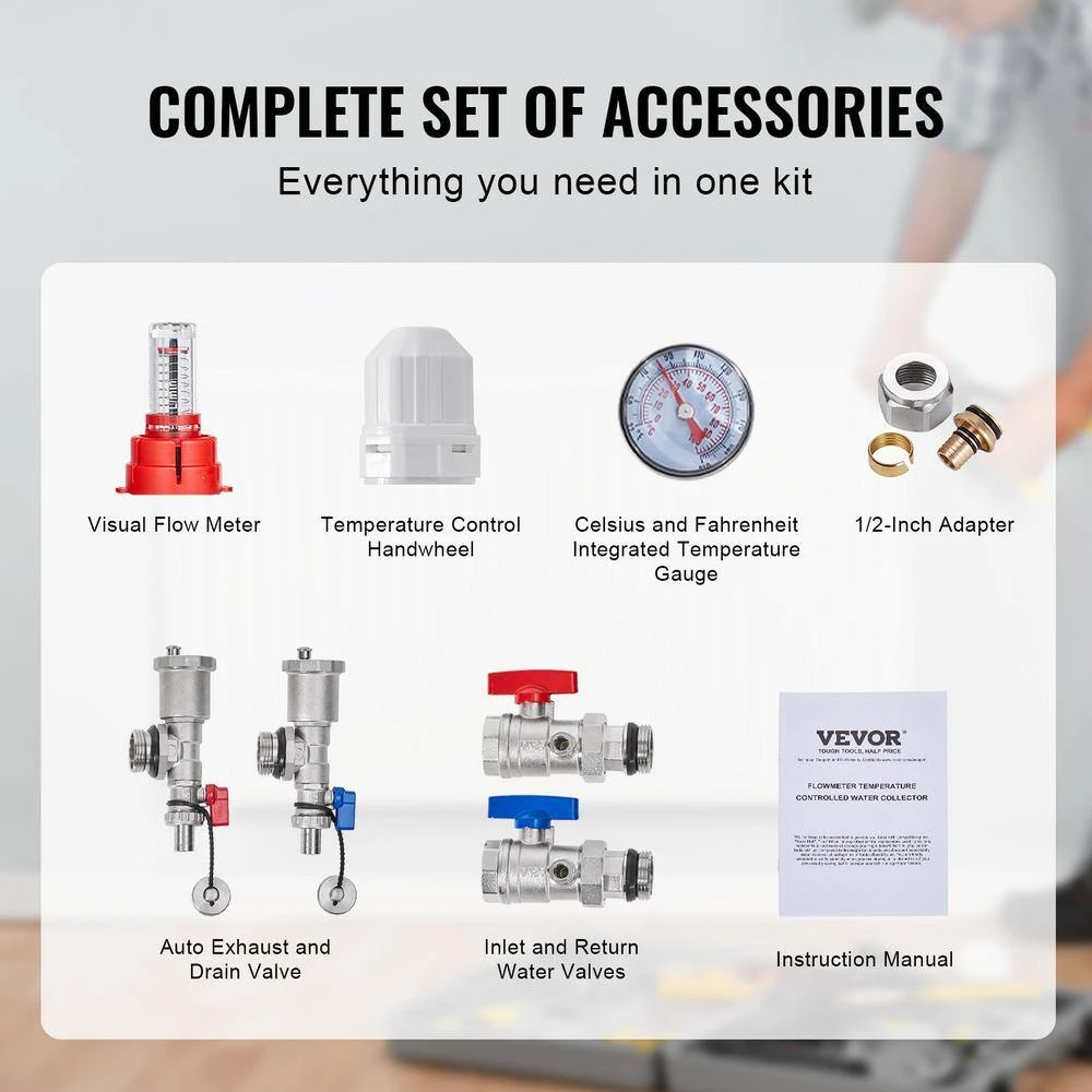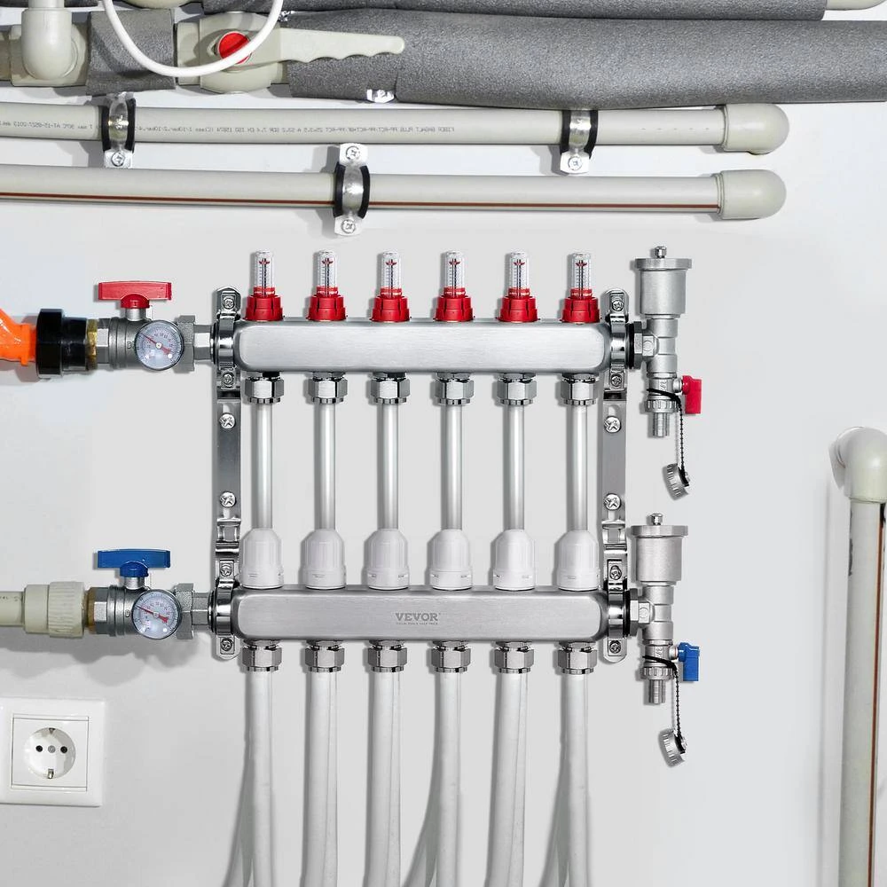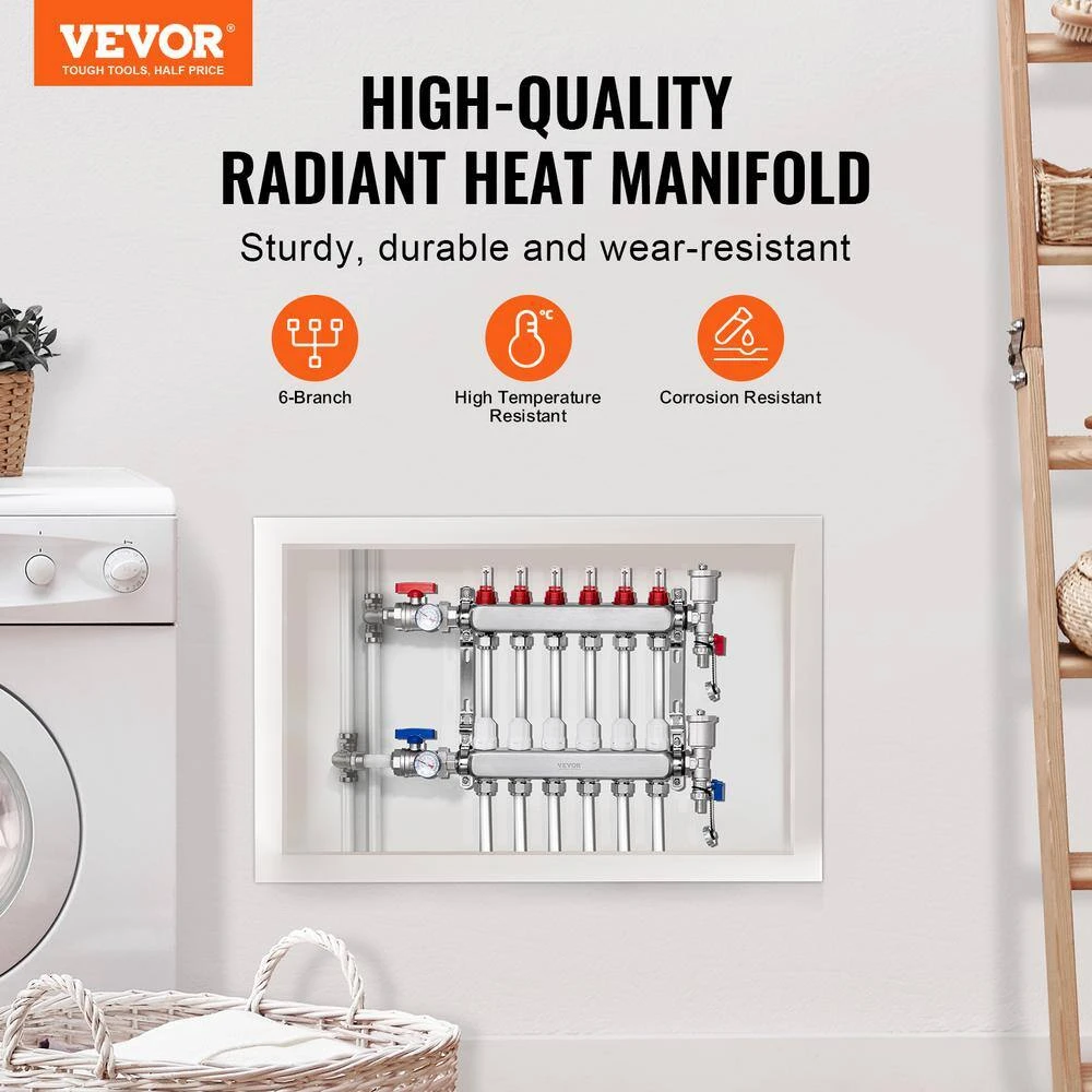 VEVOR Radiant Heat Manifold. Choose VEVOR 6-branch radiant heat manifold for fast and reliable heating. With a flow rate of up to 5L/min, it provides rapid and consistent warmth throughout space. SUS304 stainless steel structure offers exceptional high-temperature and corrosion resistance, ensuring long-lasting performance.