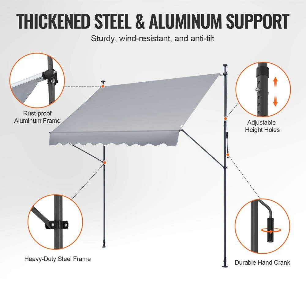 VEVOR Patio Awning Retractable-Transform Your Outdoor Space with Our Easy-to-Install Retractable Patio Awning. The large 98 x 47 in. retractable patio awning is primarily made from steel and features a 180G double-sided PU coating, providing UV protection with a rating of UV 80-plus. It offers sunshade and waterproof capabilities, with an adjustable support pole height from 86 to 122in., making it suitable for various door and window heights. The fabric can be easily extended and retracted for storage, ensuring user-friendly operation without the need for drilling, and can be installed by 1-person.