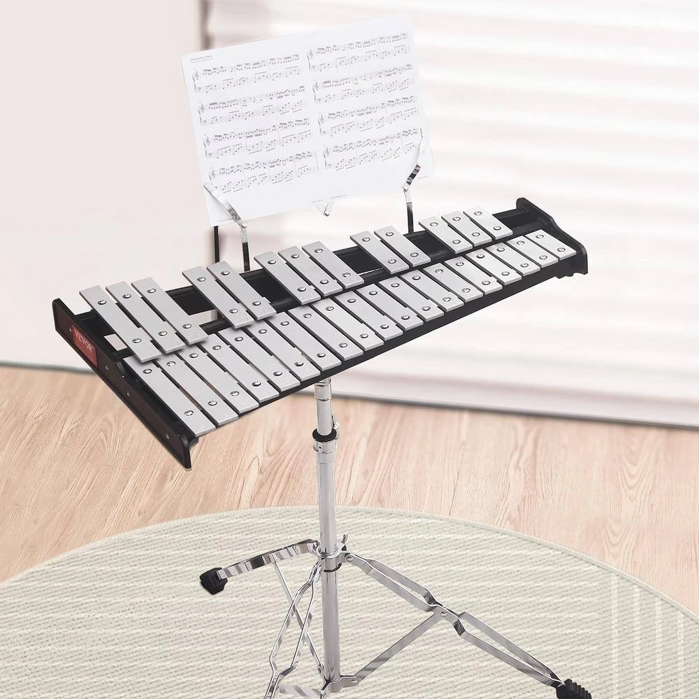 VEVOR 32 Notes Glockenspiel Xylophone Bell Kit-Professional Percussion Instrument Set The professional 32 note glockenspiel xylophone bell set includes: 32 note xylophone x1, carrying bag x1, adjustable stand x1, music stand x1, practice pad x1, mallets x4, drumsticks x2, instruction manual x1, clamps x2 and an 8 in. practice pad. It can be used for school curriculum, band performances and leisure entertainment. The wide range of notes from F5 to C8 and high-quality materials ensure comfort during daily use.