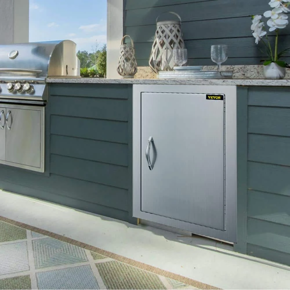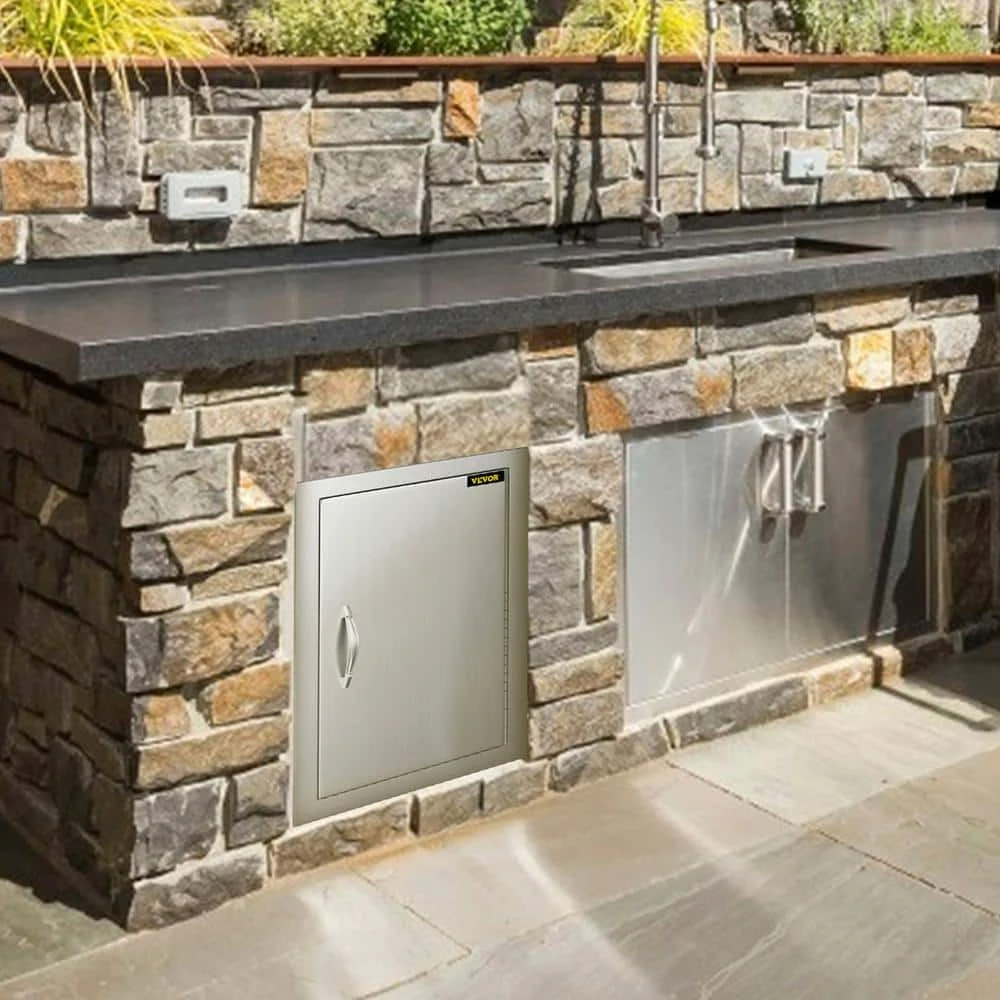 The VEVOR BBQ island door is designed for the outdoor kitchen and BBQ island, being an elegant addition to your cooking area. With premium stainless steel, this outdoor BBQ door features improved corrosion-proof and scratch-proof performance, withstanding-years of exposure to all kinds of weather. In addition, the seamless design and magnetic closing system keep the stainless steel door tightly sealed, with no dust, rainwater, or flies accessible.