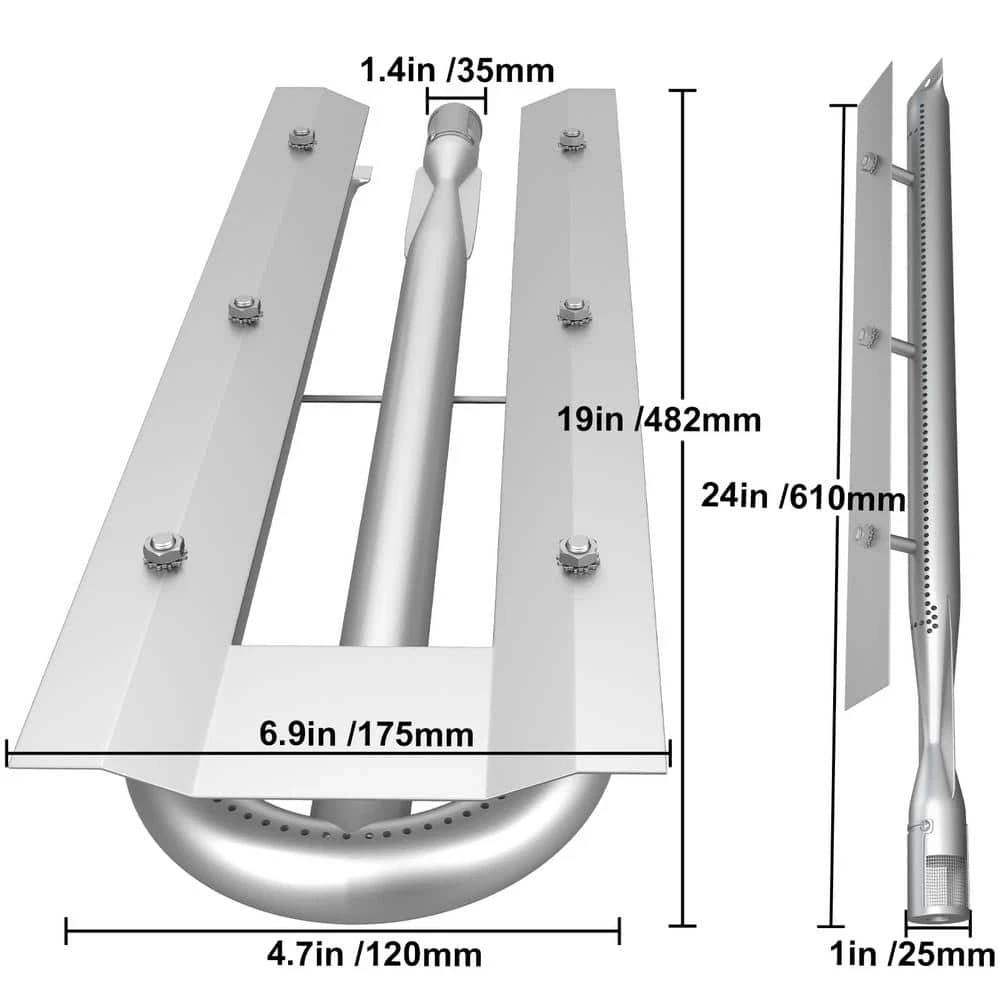 - Specifications: material: stainless steel, diameter of air inlet: 1.4 in./1 in., size of replacement u burner: 21.7 in. x 6.9 in. x 2.4 in., size of straight tube burner: 24 x 2 x2 in., product weight: 9.6 lbs.