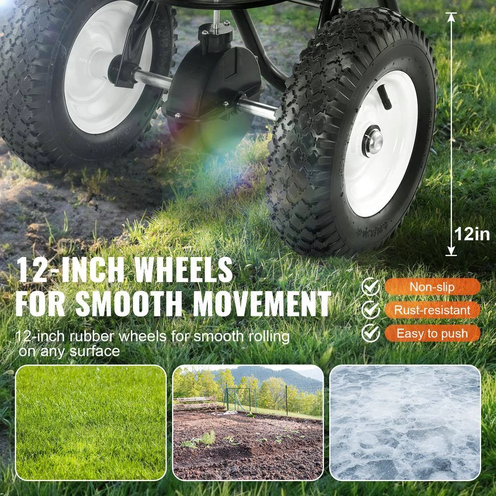 - Large wheels: its robust 12 in. wheels effortlessly handle every bump and dip on your lawn, made of durable rubber, these wheels are skid-resistant and facilitate easy maneuverability, whether making sharp turns or maintaining a steady course, this garden seeder gets the job done effortlessly