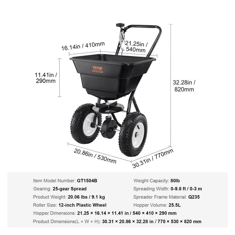 - specifications: item model number: GT1504b, load capacity: 80 lb., settings: 25 spread settings, spread w.: 0-3 m/0-9.8 ft., product weight: 9.1 kg/20.06 lbs., dimensions: 770 mm x 530 mm x 820 mm/30.31 in. x 20.86 in. x 32.28 in., spreader frame material: Q235, wheel size: 12 in. rubber wheels, hopper capacity: 25.5 l, hopper dimensions: 540 mm x 410 mm x 290 mm/21.25 in. x 16.14 in. x 11.41 in.