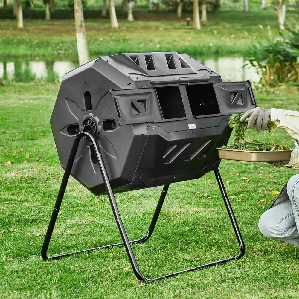 - Dual chamber, high capacity: our compost bin features a dual chamber with a generous capacity of 43 gal. perfect for large families and avid gardeners, you can simultaneously compost in one chamber while adding new organic material to the other, reducing overall composting time