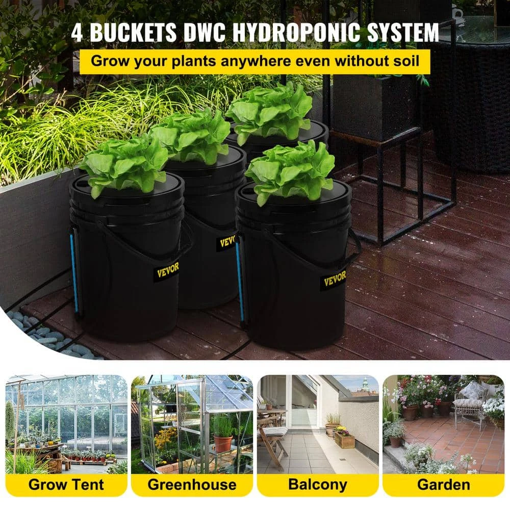 - Complete hydroponic grow kit: the DWC bucket system is easy to use with complete accessories, including 4 planting buckets, 1 reservoir bucket, 1.5 m water hose, 6 m air hose, 5 drain valves, 1 set of connectors, 1 water level device, 4 check valves, 4 air stones, 1 air pump, clay pebbles, and 1 instruction manual
