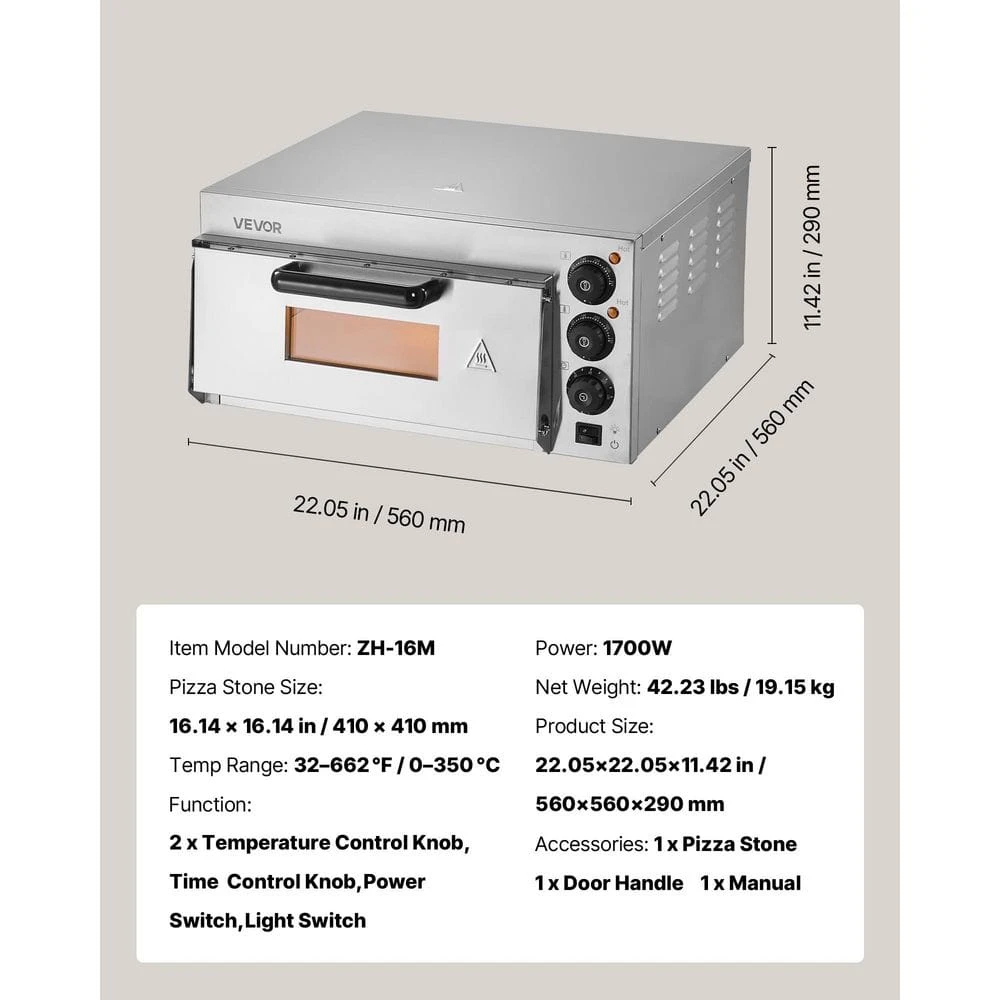 VEVOR 16 in. electric pizza oven boasts food-grade stainless steel construction, 122°F to 662°F broad temperature range and 0-minutes to 60-minutes precise timing control. 1700-Watt high power and dual heating tubes deliver even and efficient heat distribution for perfect baking results every time. In just few minutes, the high-powered 1700-Watt pizza oven enables you to create mouthwatering, crispy pizzas. With its top and bottom dual heating tubes, it delivers 360° uniform baking and rapid heat for fast cooking, resulting in perfectly cooked food every time.
