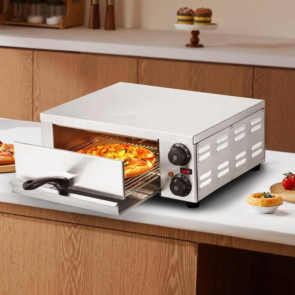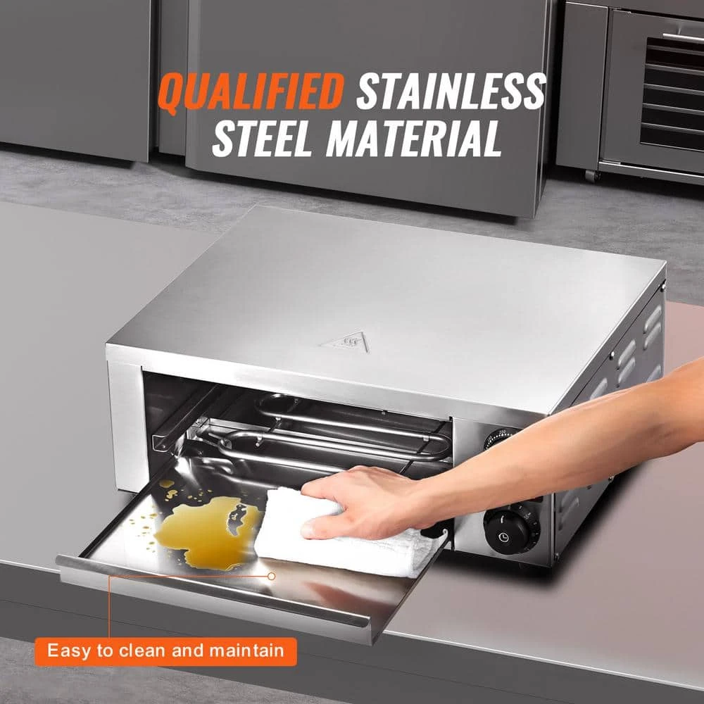 - High Quality Electric Pizza Oven: Crafted with food-grade stainless steel, VEVOR electric pizza oven assures you a secure and hassle-free baking experience. Coupled with the provided baking grill and crumb tray, this countertop pizza oven is able to bake crispy pizzas up to 12 inches, perfect for your kitchen, dorm, camping, and parties