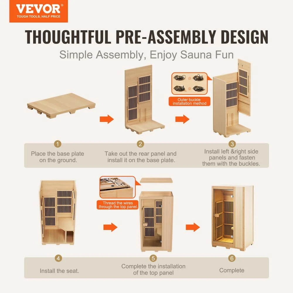 - Pre-assembled design: the sauna room features a pre-assembled design, requiring only simple assembly upon receipt, clear installation instructions and wiring diagrams are provided, eliminating the hassle of complicated screw fittings