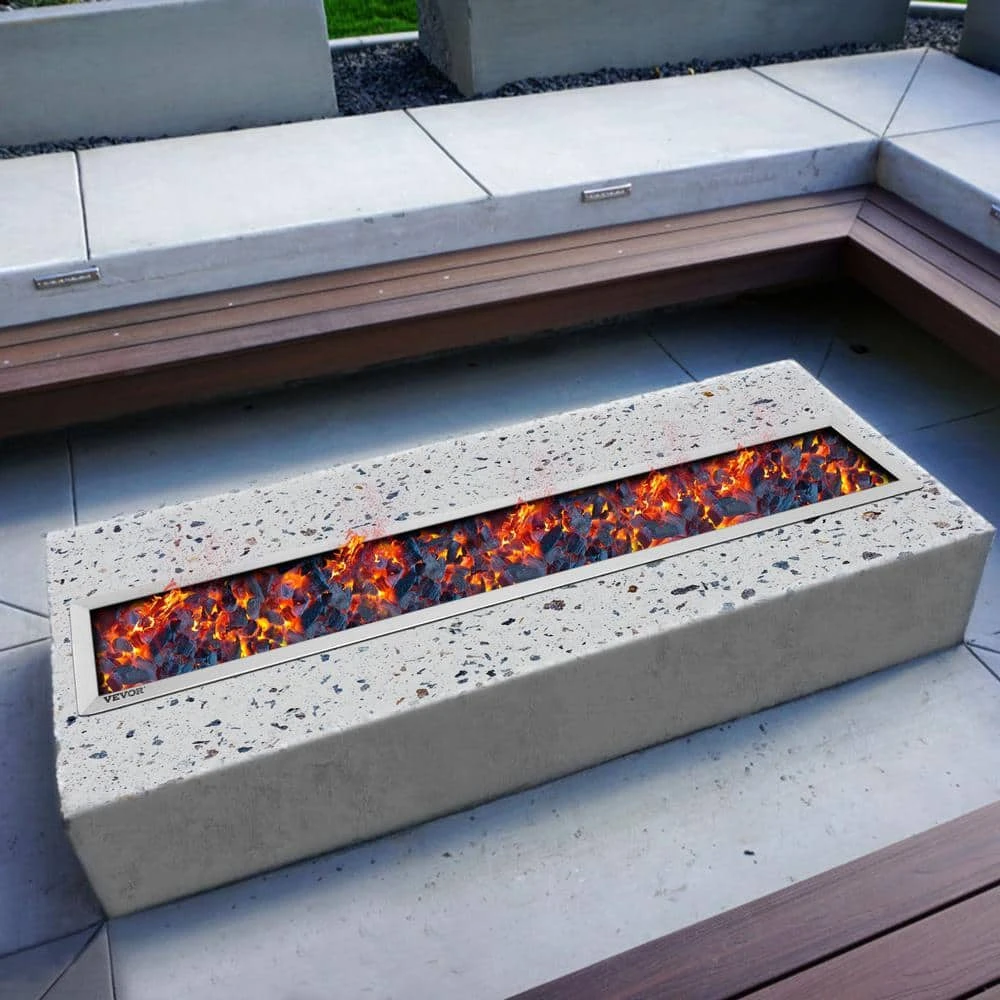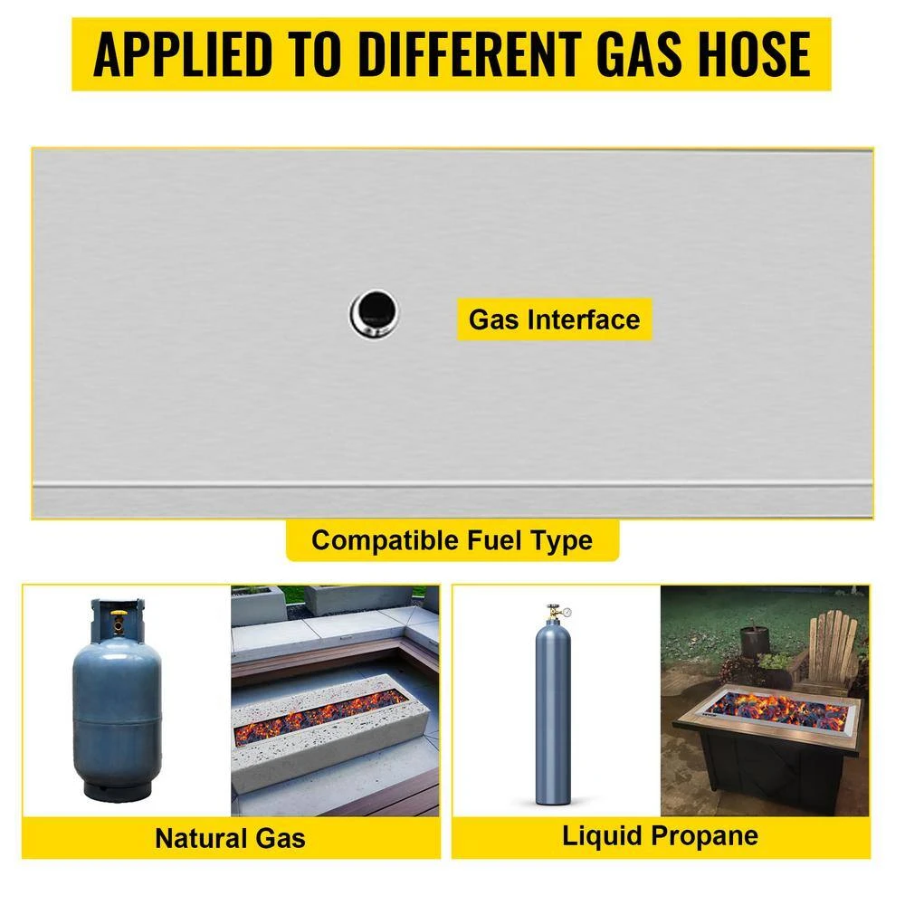 - Specification:Material: Full Stainless Steel Construction,Item Size(LxWxH): 61 x 8 x 2 in.,Installation size(LxW): 59 x 6 x 2 in.,Gas Inlet Size: 1/2 in. NPT,Fill-in Fire Glass: About 50 lb.,Applicable Fuel: Propane Gas/Natural Gas,Gross Weight: 12 lb.