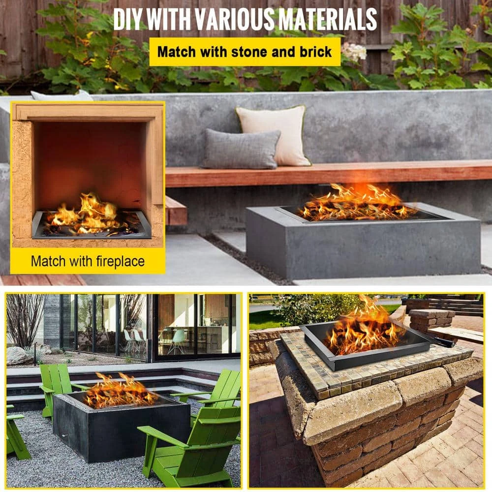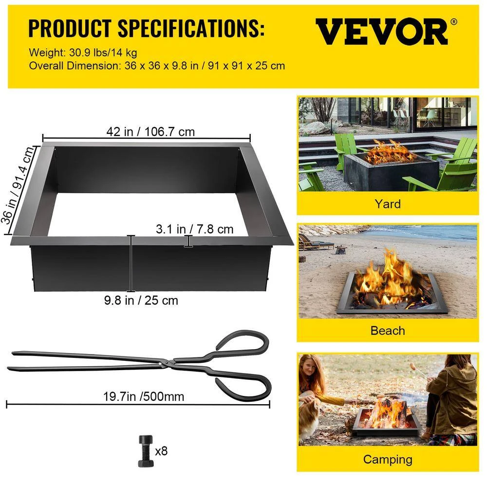 36 in. x 36 in. Square Fire Pit Ring. This fire pit ring is constructed with thickened steel plates with a blacking coating surface for high heat-proof and wear-proof. it has a 36 in. x 36 in. large capacity for holding more burning materials and can be DIY by your hand for various decoration needs it is easy to assemble with 8 screws and convenient for operation with a pair of extra tongs it is ideal for camping, fishing or barbecue.
