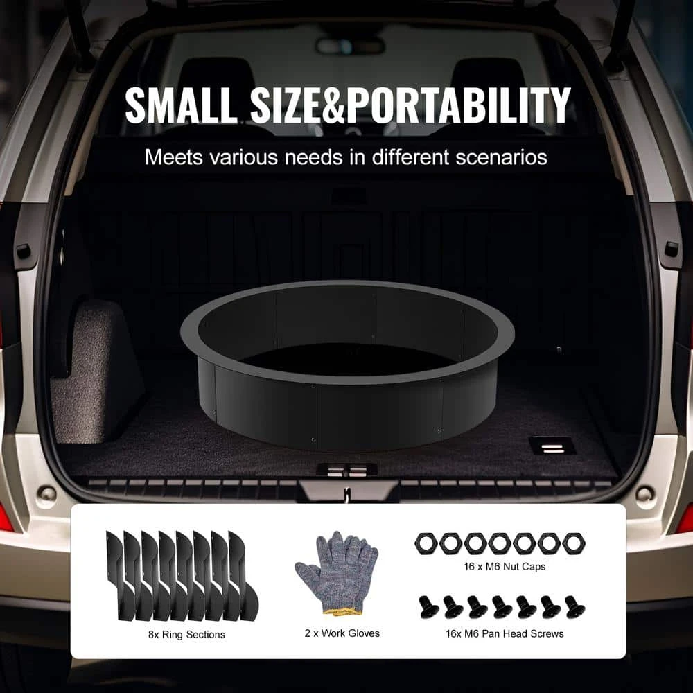 Enjoy Cozy Fires with VEVOR’s Rust-Resistant Fire Ring. This fire ring, made from high-temperature resistant carbon steel with a matte black powder coating, resists rust and corrosion. It provides ample space for flame growth, ideal for park or backyard camping, creating a warm atmosphere for holiday nights or gatherings with friends.
