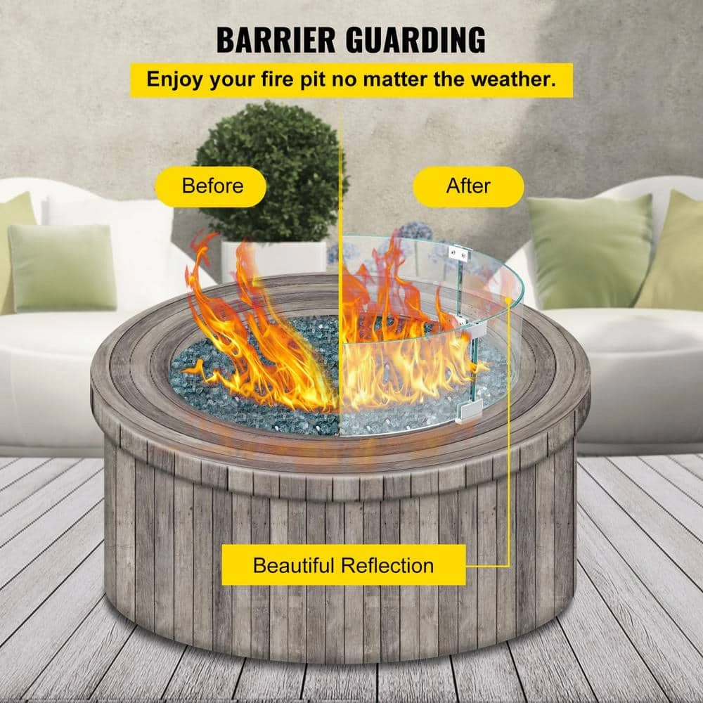 The VEVOR Fire Pit Wind GuardFire pit flame guard effectively reduces wind compact on fire table and greatly fit in your patio or garden, it shelters the flame while providing a safety barrier for users along with polished edges. Easy set and use with necessary accessories. Long-lasting durability assured with tempered glass and aluminum alloy corner brackets.