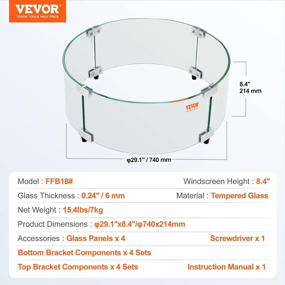 - Specifications:Model: ffb18#,Main Material: Tempered Glass,Net Weight: 15.4 lb. / 7 kg,Product Dimensions: ∅29.1 in. x 8.4 in. / ∅740 x 214 mm,Windscreen Height: 8.4 in. / 214 mm,Thickness: 0.24 in./6 mm