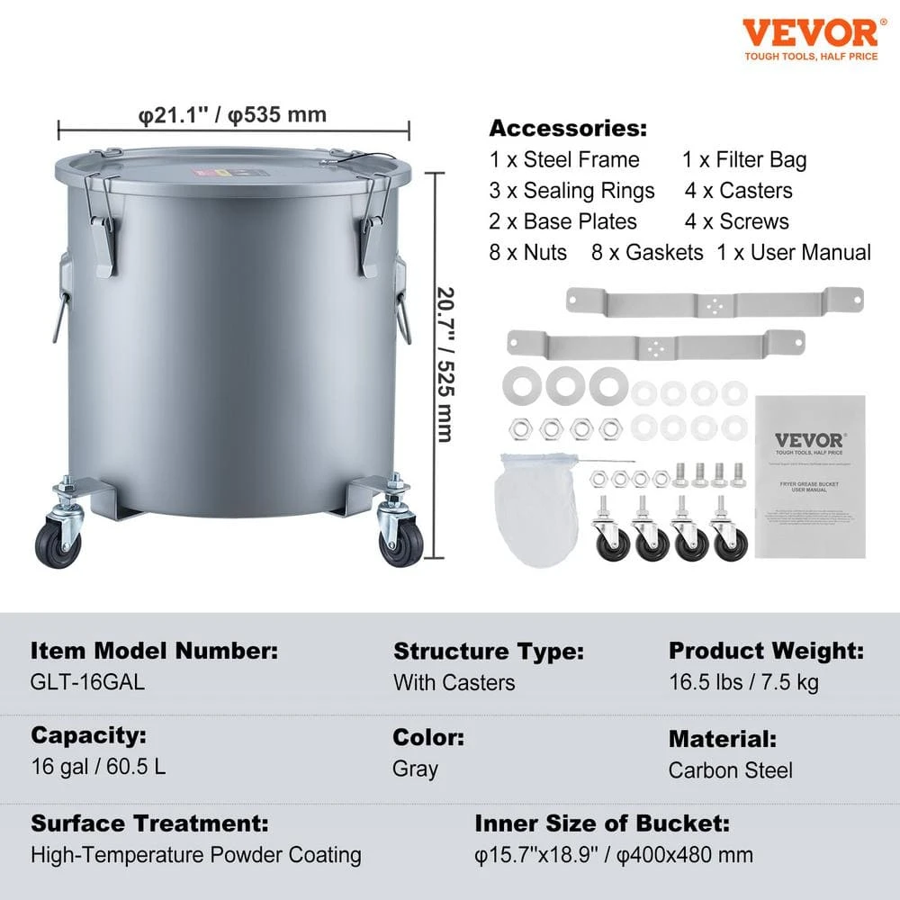- Massive 16-Gal. capacity: with dimensions of 21.1 in. / 535 mm in Dia and 19.7 in. / 500 mm in height this fryer grease bucket packs a punch, say goodbye to frequent trash can emptying-it can hold up to 16 Gal. of oil, plus, we’ve thrown in a nifty filter bag to sift out any pesky impurities, keeping your oil fresh and clean for longer