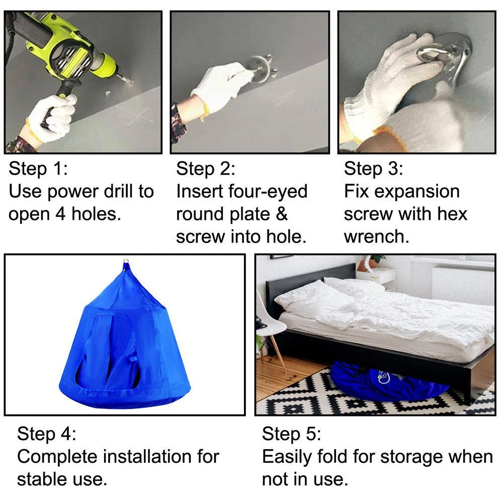 - Assemble in Minutes: You can hang this tent under a tree to enjoy the cool shade and feel the summer vibes of nature. Of course, you could also hang it indoors from a ceiling or a hammock metal stand to read or relax in the winter. Besides, it comes with a hanging hardware kit, including adjustable hanging ropes, carabiners, a two-layer tent top, inflator, sponge shaping tubes, and expansion screws. Everything you need is provided. Get ready to enjoy your vacation without ever having to leave your house