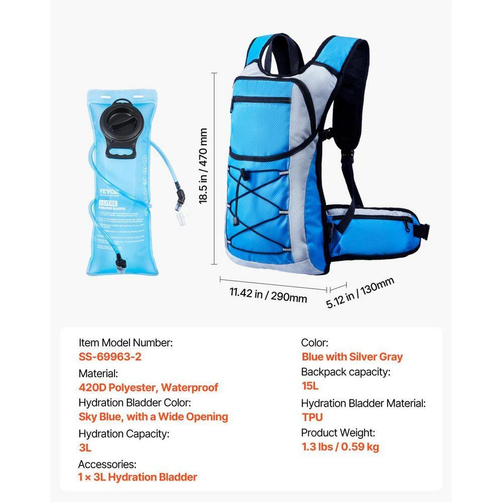 - Specifications: item model number: SS-69963-2, color: blue with silver gray, material: 420d polyester, waterproof, backpack capacity: 15l, hydration bladder color: sky blue with a wide opening, hydration bladder material: tpu, hydration bladder capacity: 3l, product dimensions: 18.50 x 11.42 x 5.12 in. / 470 x 290 x 130 mm, product weight: 1.28 lb. / 0.58 kg