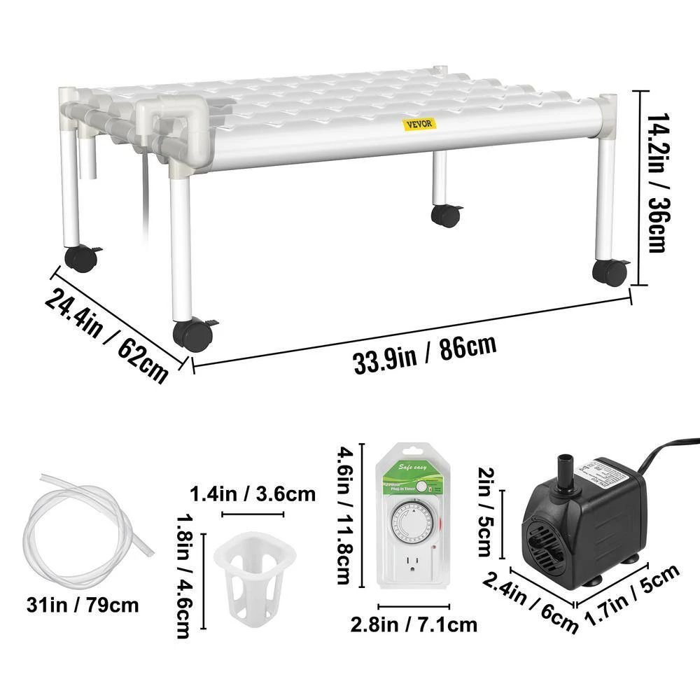 - 54 sites hydroponic growing system: layers: 1, pipe quantity: 6, hole quantity: 54, pipe size: 2.5 in. x 31 in. spacing between holes: 2 in. overall dimension: 33.9 in. x 24.4 in. x 14.2 in. the proper dimension allows you to harvest fresh vegetables as few or as many as you like