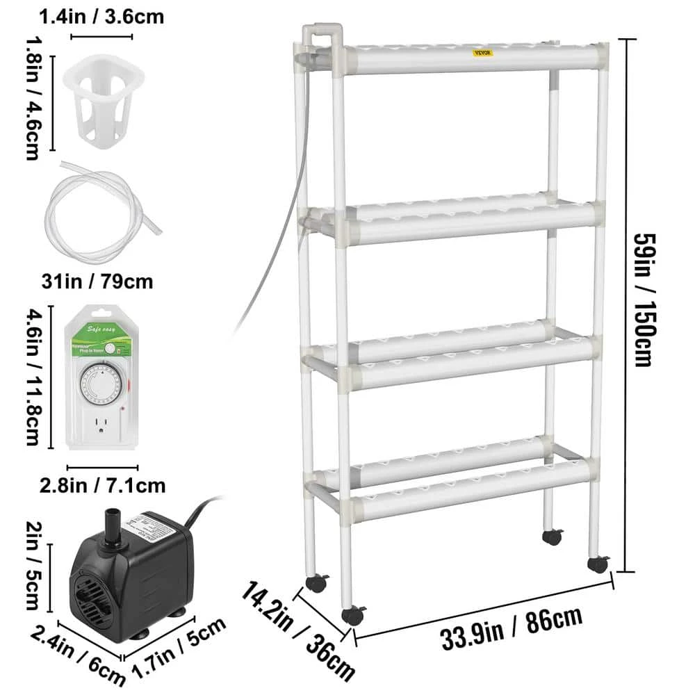 - 72 sites hydroponic growing system: layers: 4, pipe quantity: 8, hole quantity: 72, pipe size: 2.5 in. x 31 in. spacing between holes: 2 in. overall dimension: 33.9 in. x 14.2 in. x 59 in. the proper dimension allows you to harvest fresh vegetables as few or as many as you like