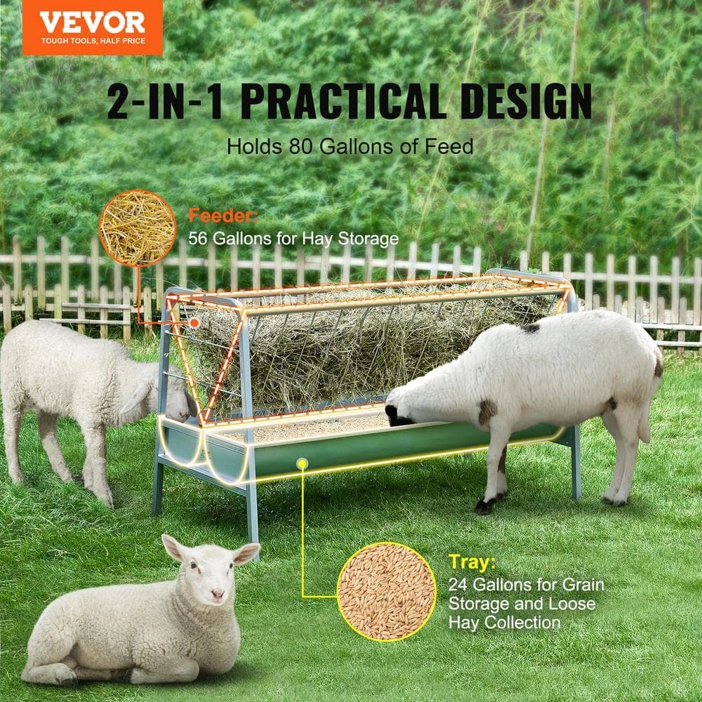 VEVOR 2 in 1 Grain and Hay Feeder 80-Gal.This wall mounted feeder combines a large capacity of 56 gal.s of hay feeder and 24 gal.s of grain pan, 2-in-1 feeding, heavy-duty steel and rounded edges design, suitable for up to 10-12 goats to eat at the same time. The galvanized steel, full welding process ensure durability.