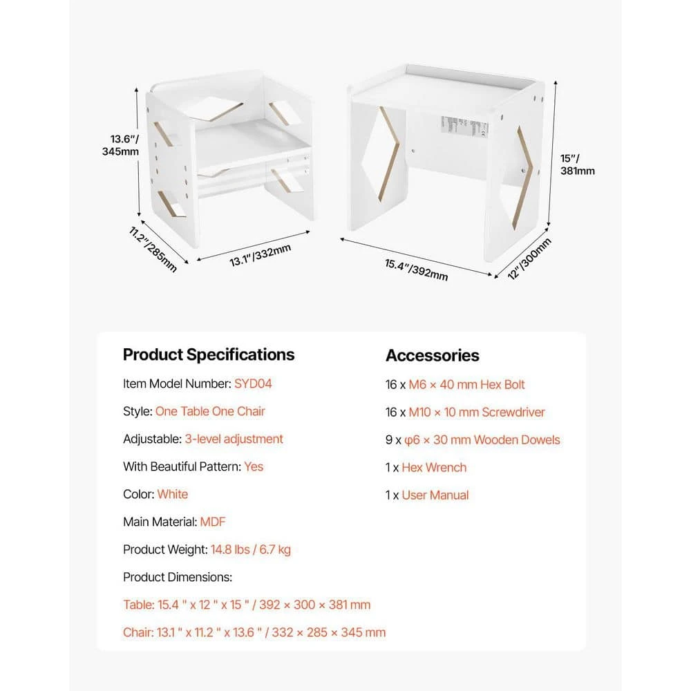 - Specifications: item model number: syd04, style: one table one chair, adjustable: 3-level adjustment, with beautiful pattern: yes, color: white, main material: mdf, product weight: 14.8 lbs. / 6.7 kg, table: 15.4 x 12 x 15 in. / 392 x 300 x 381 mm, chair: 13.1 x 11.2 x 13.6 in. / 332 x 285 x 345 mm
