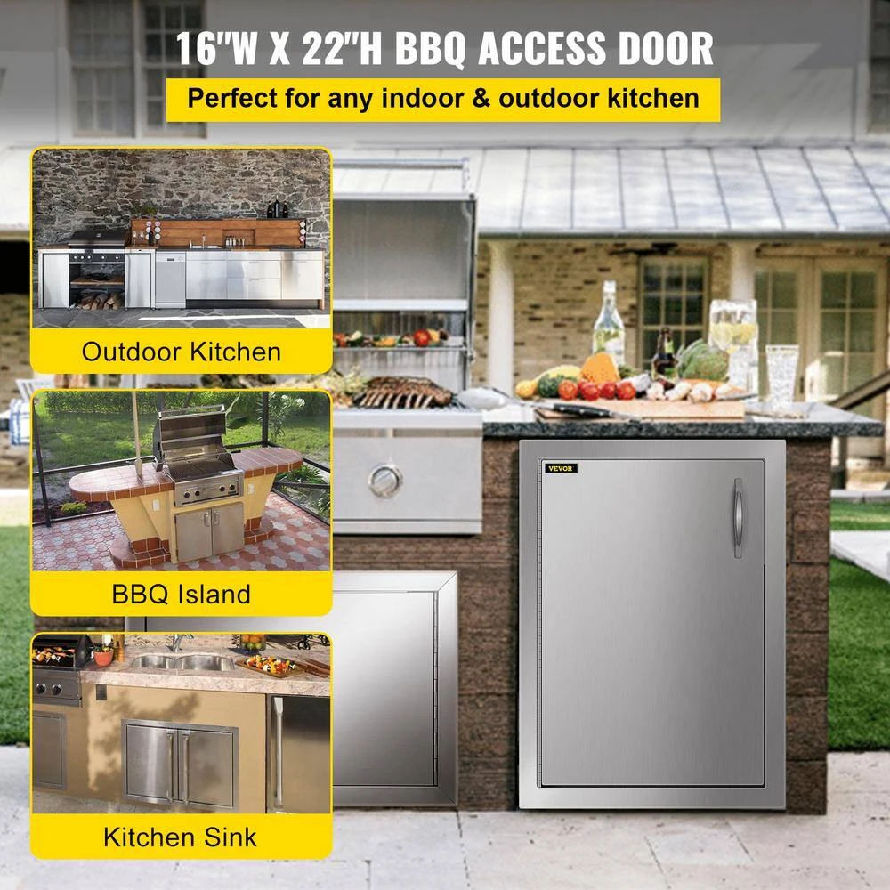 The VEVOR BBQ island doors are designed for the outdoor kitchen and BBQ island, being an elegant addition to your cooking area. the seamless design and magnetic closing system keep the stainless steel doors tightly sealed, with no dust, rainwater, or flies accessible. This door is finished to match all major brands of grills.