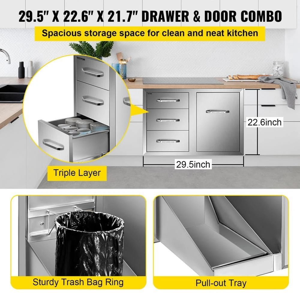 - Drawers Combo w/Trash Bag Ring: The overall size for our drawer & door combo is 29.5 x 22.6 x 21.7 in..Cutout Size: 28.0 x 21.4 x 20.1in.. Triple-layer drawers can keep your kitchen neat and everything organized. The hinged door by the side has a sturdy trash bag ring and pull-out tray for perfect trash storage