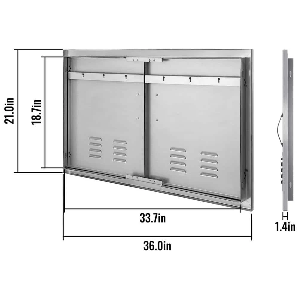 - Durable Construction: Overall dimensions: 36 in. W x 21 in. H, cutout dimensions: 33.7 in. W x 18.7 in. H, the outdoor kitchen doors, constructed with stainless steel, feature corrosion and abrasion resistance, the brushed surface makes the door appealing, and it is easy to clean with no marks or smudges left, all seamless design and no sharp corners safeguard users’ security