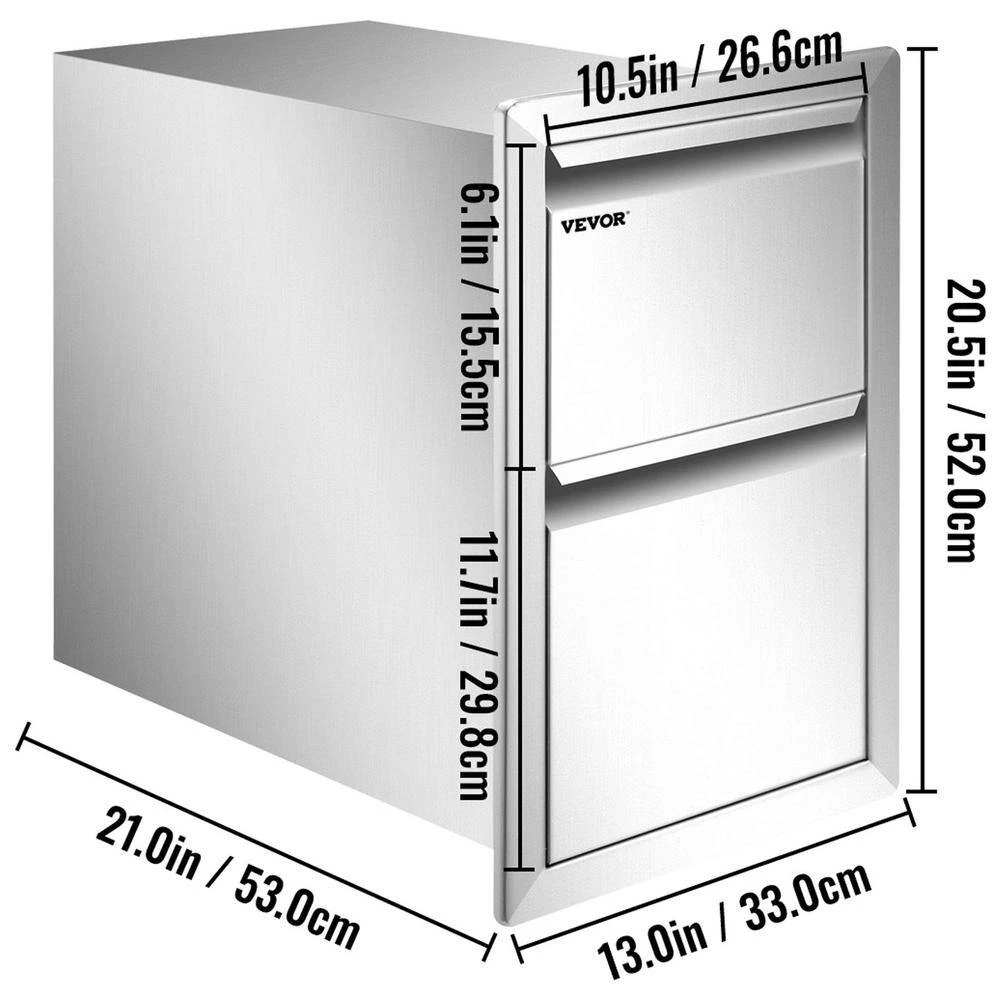 - Large Storage Coverage: The overall size for our outdoor kitchen drawer is 13 in. W x 20.5 in. H x 21 in. D, cutout size: 10.7 in. W x 18.2 in. H x 21 in. D . It provides spacious storage space for you to keep everything organized. You will have a clean and neat kitchen, all thanks to these double-layer drawers