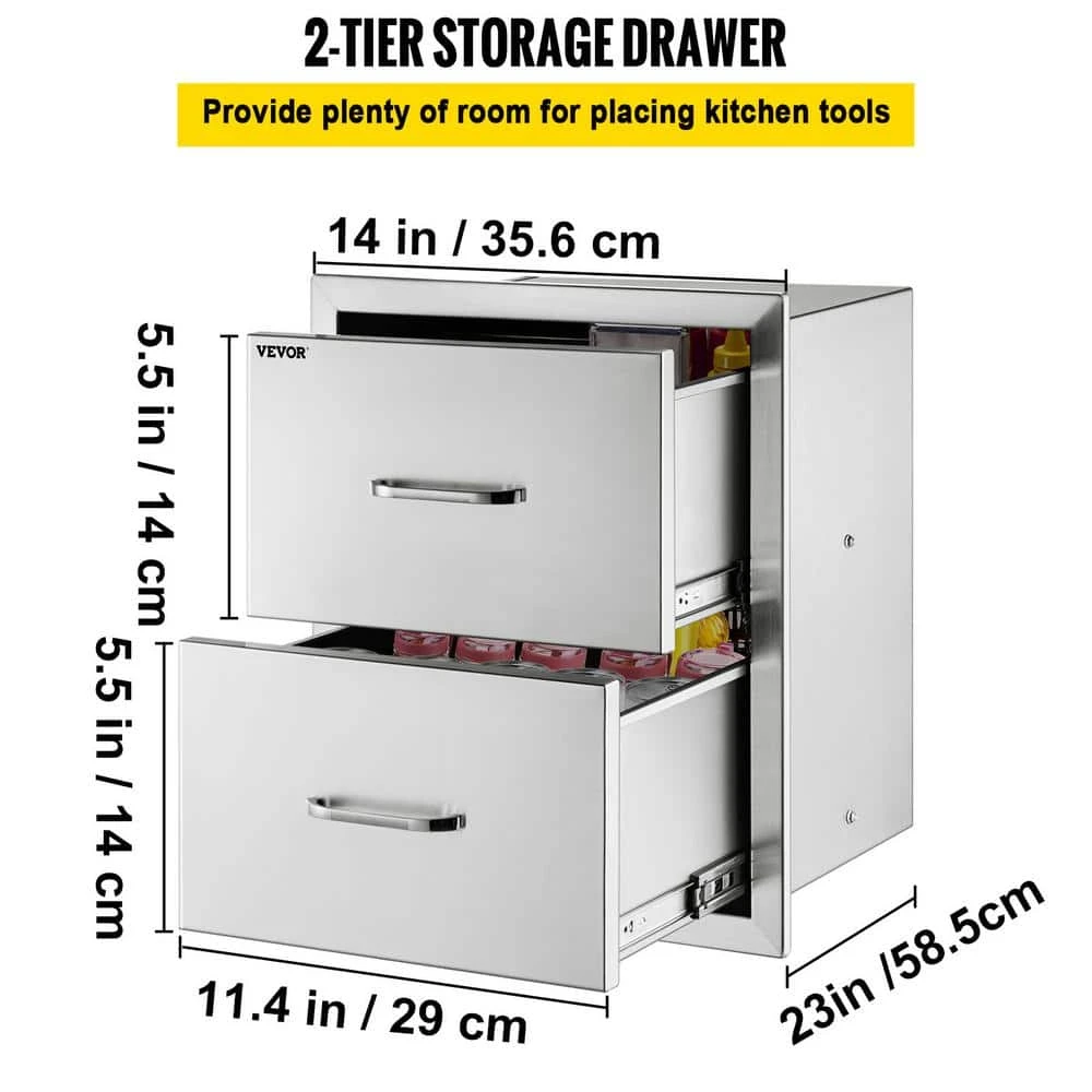 - Specifications:Material: Food-grade Stainless Steel,Color: Sliver,The Amount of Drawer: 2,Overall Size(W X H X D): 14 x 14.4 x 23 in.,Cutout Size(W X H X D): 11.7 x 12.1 x 23 in.,Item Weight: 28.9 lb.