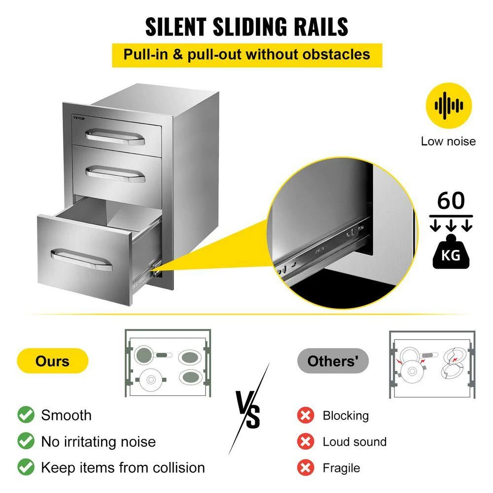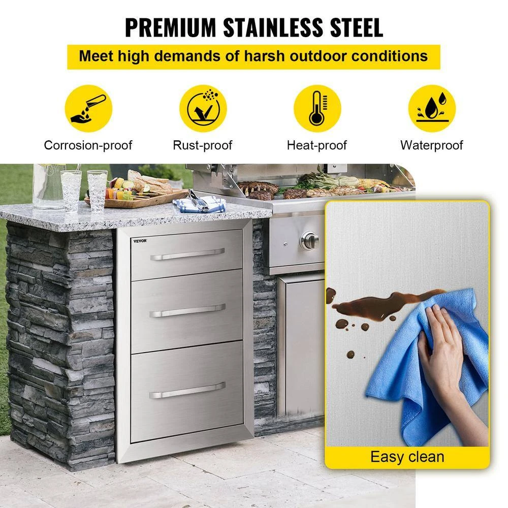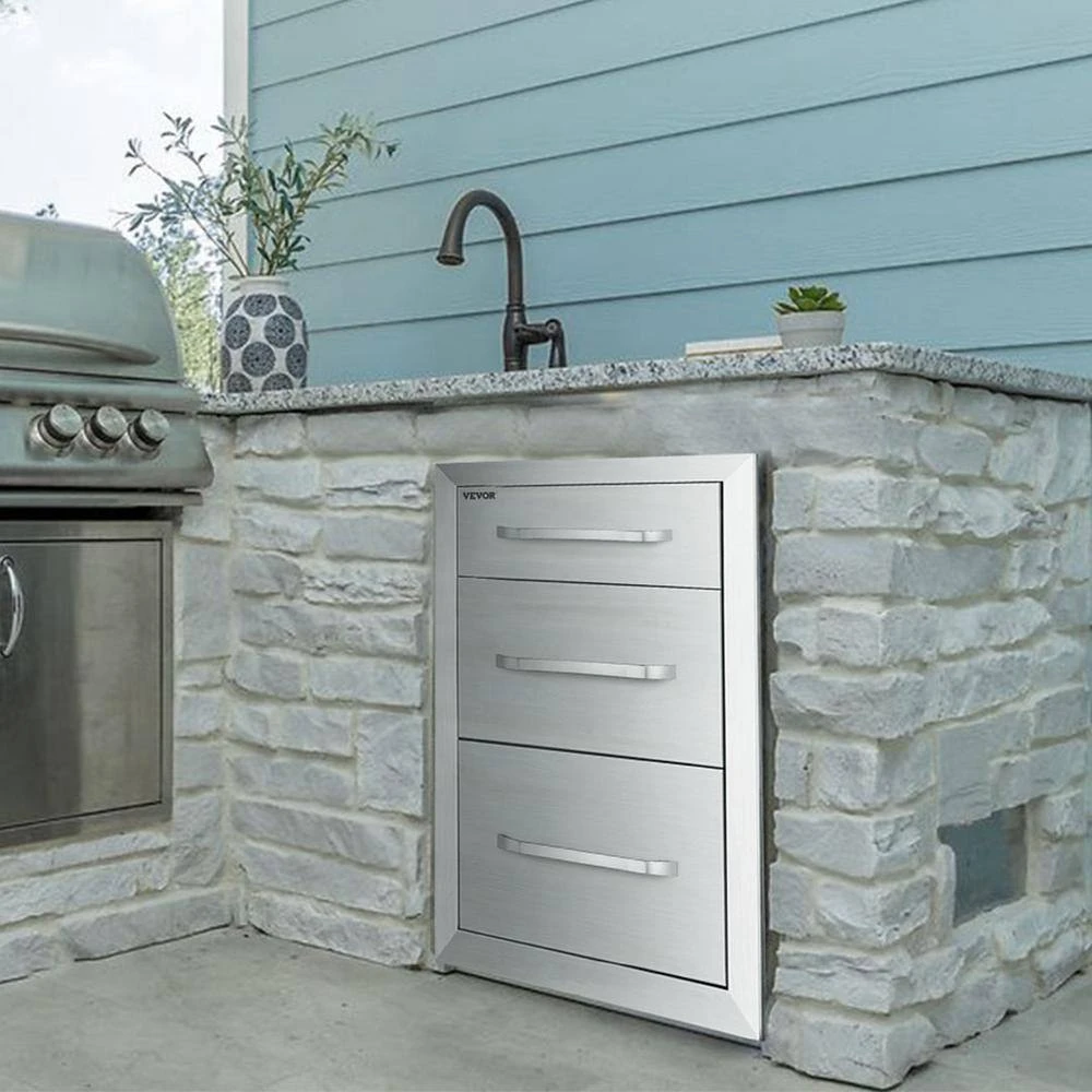The VEVOR premium outdoor kitchen drawers with double storage space, ensuring a large storage space to put kitchen things. Made of stainless steel, it is durable and sturdy for long time use. Also anti-corrosion and easy to clean. With the fully enclosed box, it can effectively prevent the insides from rain, wind, dust, and insect. Perfect for the outdoor kitchen and BBQ island to use.