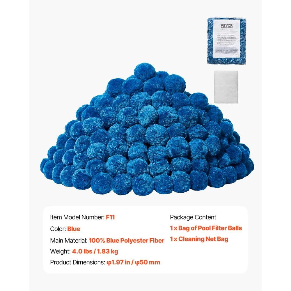 4 lbs. Pool Filter Balls for Sand Filter. Elevate your filtration game with our pool filter balls, crafted from 100% blue polyester fiber. Our balls bring superior filtration performance, are compatible with various filter systems like sand filters, cartridge filters, and DE filters. Enjoy swimming in crystal clear water in no time.