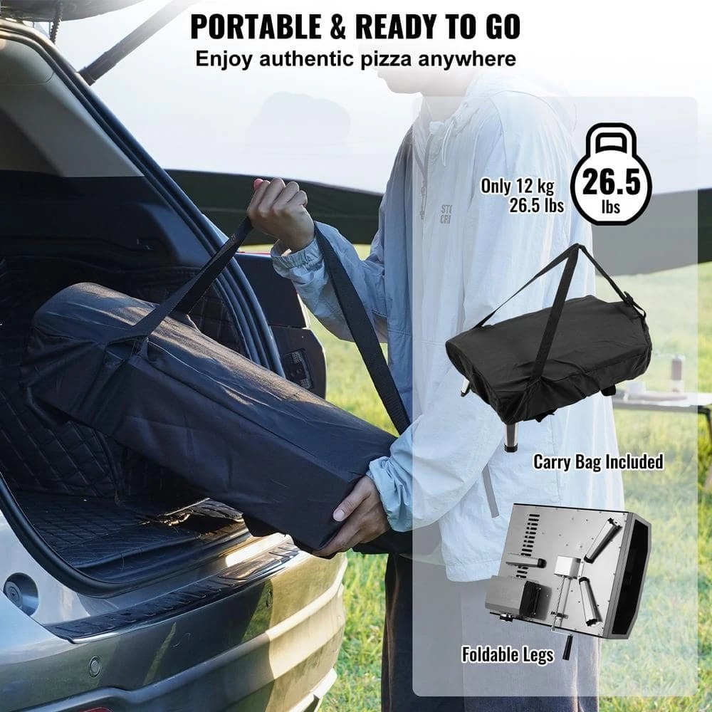 13 in. Gas Outdoor Pizza Oven. Gas-powered pizza oven that bakes a 13 in. pizza in 90-seconds, reaching temperatures up to 1000°F/540℃. The foldable legs make it lightweight at 26.5 lbs./12 kg, convenient to carry to any outdoor location, ideal for family and friends gatherings.