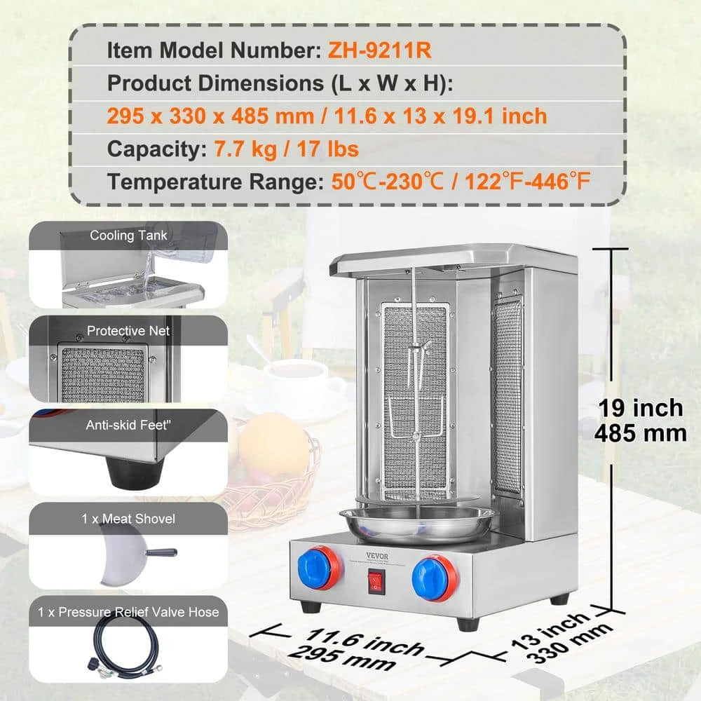 - Package content:1 x shawarma grill machine,1 x pressure relief valve hose,1 x meat shovel,1 x user manual