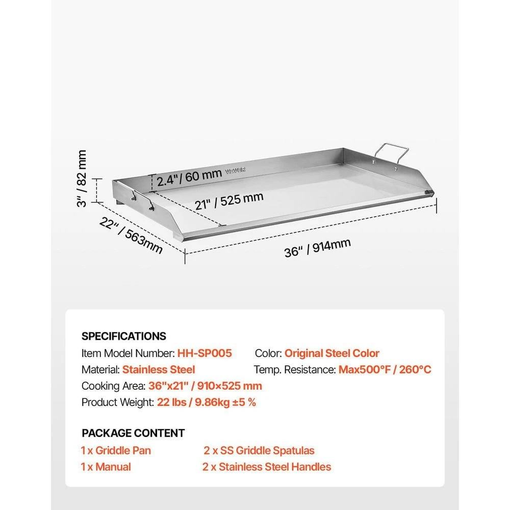 - Specifications:Item Model Number: HH-SP005,Color: Original Steel Color,Material: Stainless Steel,Temp. Resistance: Max500°F / 260°C,Cooking Area: 36in.x21in. / 910×525 mm,Product Weight: 22 lbs. / 9.86 kg ±5 %