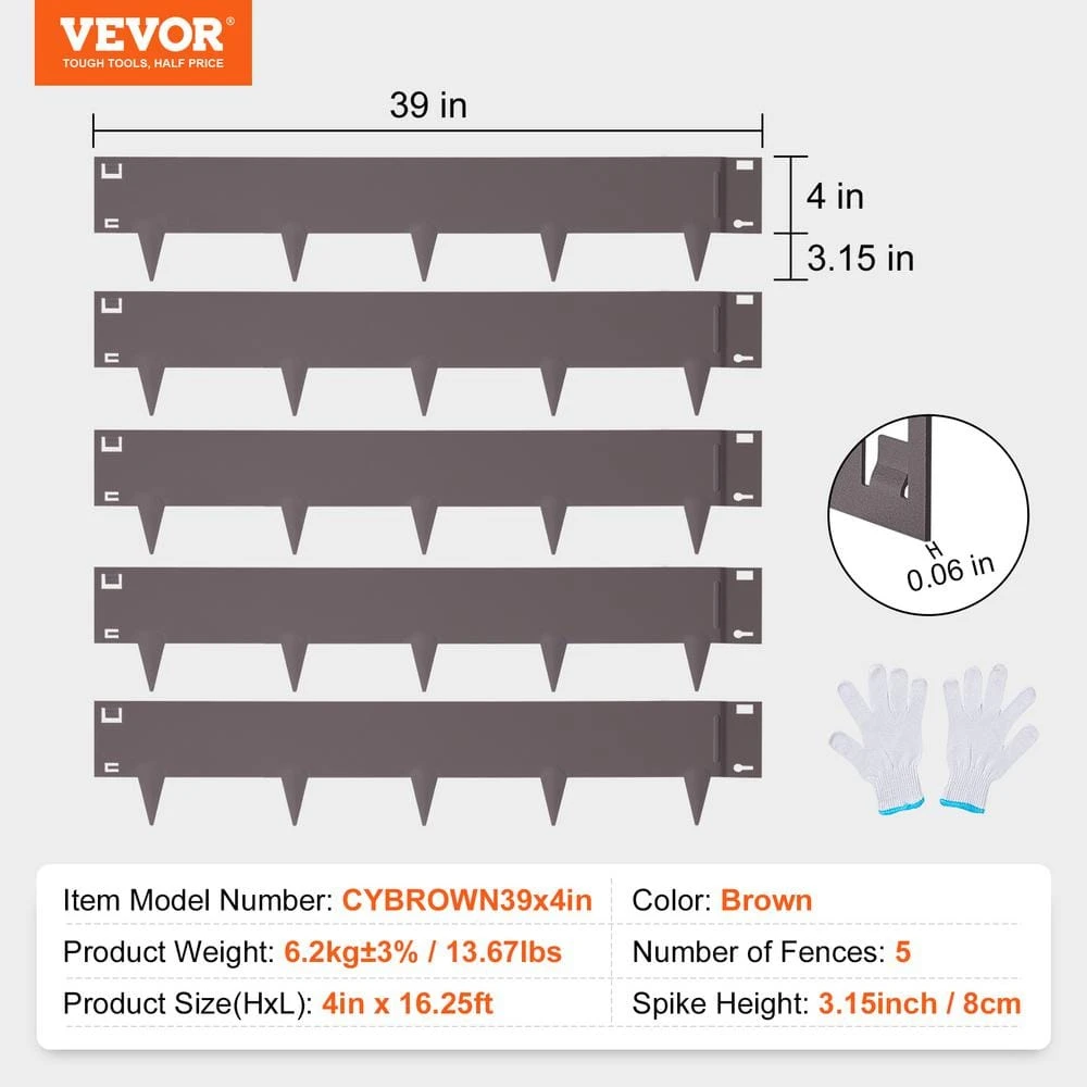 - Various sizes: VEVOR steel landscape edging is available in a set of 5-pieces, each measuring 39 in. x 4 in., the extended spikes make secure ground anchoring, allowing you to create clean lines and spaces in your lawn. Loved by gardening enthusiasts