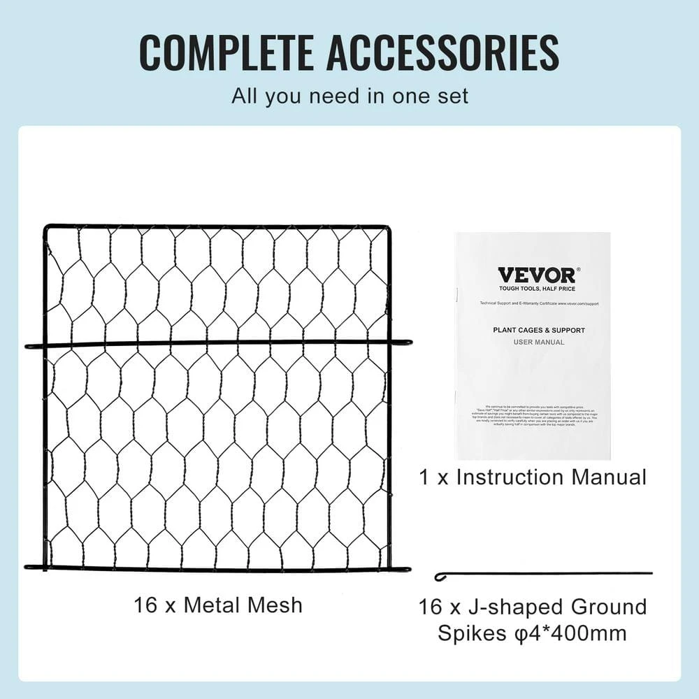 - Product specifications: our plant cages for outdoor plants include 16-pieces of metal mesh, 16-pieces j-shaped ground spikes (φ4 x 400mm) and 1 instruction manual, each component is finely forged for long-term use