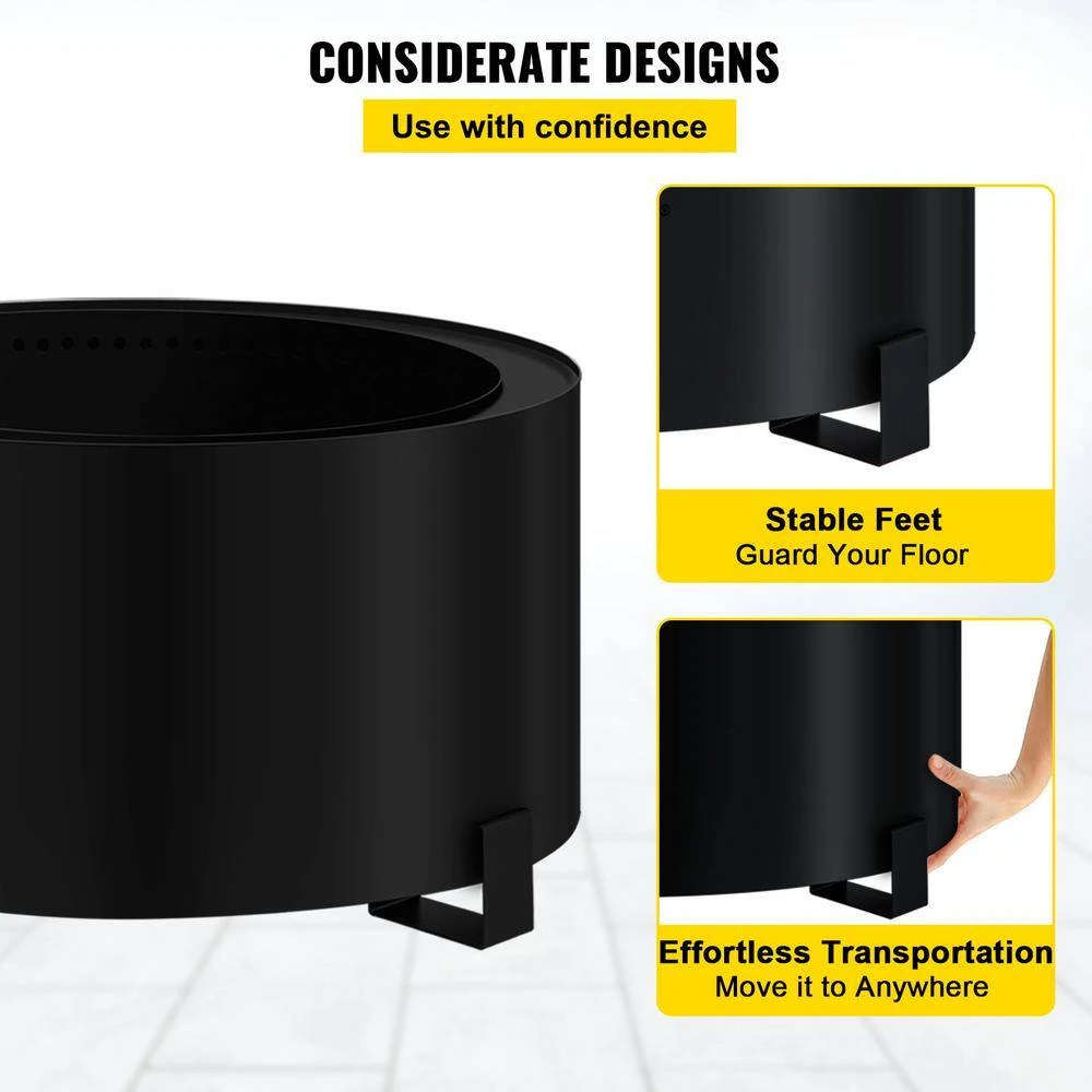 23.6 in. Smokeless Fire Pit. Our fire pit is made of carbon steel for high heat-proof and rust-proof this fire pit adopts a unique airflow plan for more complete wood combustion with almost no smoke. Come with two-piece construction, simple to put together. So whether you use the bonfire to toast some marshmallows or meat, it is the perfect backyard ambiance for your Summer party.