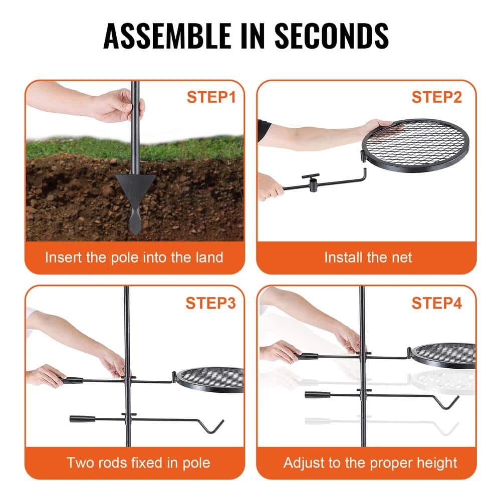 - Considerate details: with bakelite handle for easy cooking height adjustment rotate, raise, or lower for optimum cooking temperature also, 14 in. grill grate and U-shaped hook can be used with cast iron dutch ovens/tea kettles/pans, etc