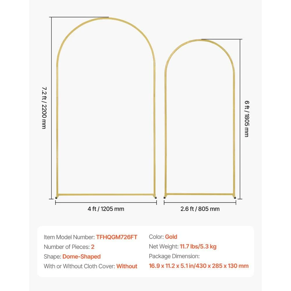 - Sepecifications: item model number: TFHQGM726FT, number of pieces: 2, shape: dome-shaped, with or without cloth cover: without, product size arch 1: 7.2 x 4 ft./1205 x 405 x 2200 mm, arch 2: 6 x 2.6 ft. /805 x 405 x 1805 mm, color: gold, net weight: 11.7 lbs./5.3 kg, product dimension: 16.9 x 11.2 x 5.1 in./430 x 285 x 130 mm
