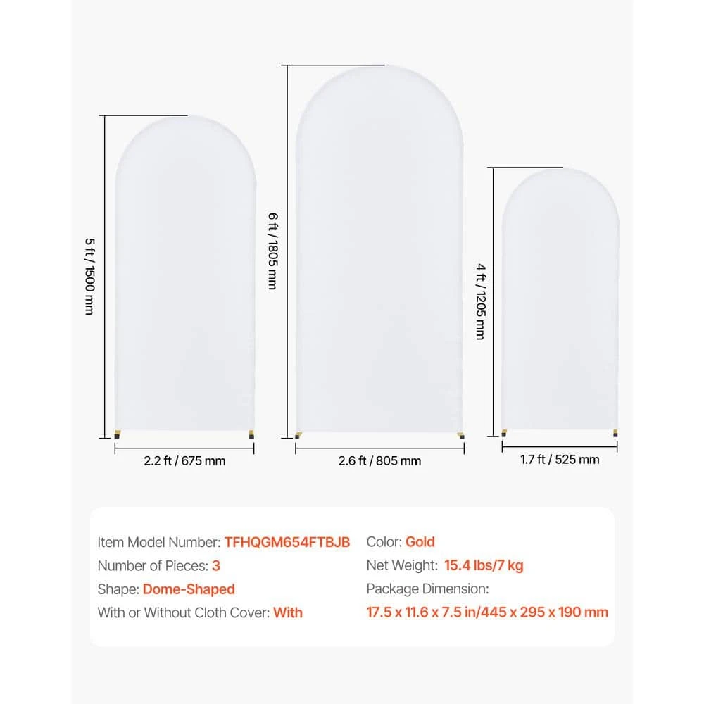 - Sepecifications: item model number: TFHQGM654FTBJB, number of pieces: 3, shape: dome-shaped, with or without cloth cover: with, product size arch 1: 6 x 2.6 ft./805 x 405 x 1805 mm, arch 2: 5 x 2.2 ft. /675 x 405 x 1500 mm, arch 3: 4 x 1.7 ft. /525 x 405 x 1205 mm, color: gold, net weight: 15.4 lbs./7 kg, product dimension: 17.5 x 11.6 x 7.5 in./445 x 295 x 190 mm